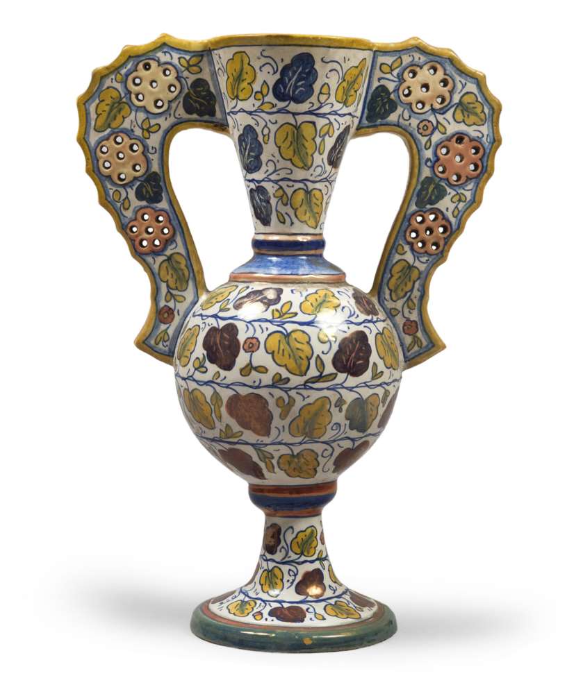 VASO IN MAIOLICA A LUSTRO, CERAMICHE RUBBOLI GUALDO TADINO, METÁ XX SECOLO a forma di anfora con decori vegetali. Marca sotto la base. h. cm. 34,5.