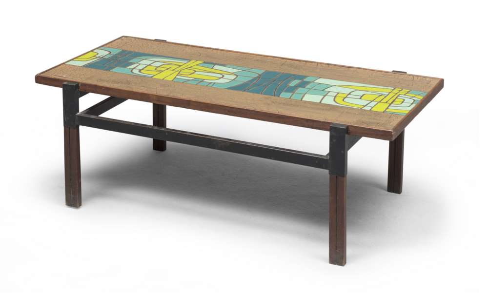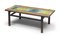 TAVOLINO IN BRONZO, ANNI '50 con ripiano dorato e decorato con smalti azzurri e verdi. Misure cm. 37 x 101 x 46.