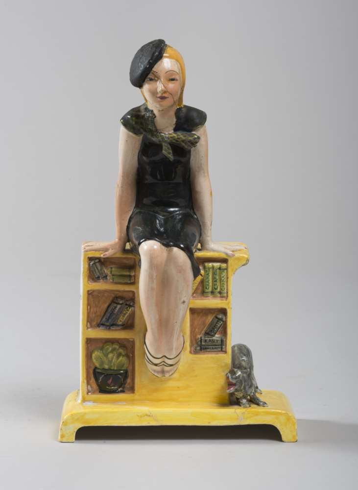 SCULTURA IN CERAMICA DIPINTA, EPIGONI LENCI ANNI '40 raffigurante donna seduta su una libreria con gatto. Marcata sotto la base. Misure cm. 37 x 22 x 12. Rotture e restauri.