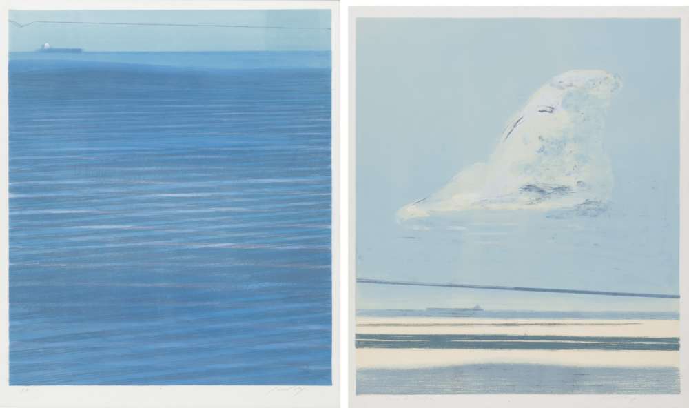 PIERO GUCCIONE (Scicli 1935) Coppia di marine Litografie a colori, ex. P.A e Prova di Stampa Misure del foglio, cm. 60 x 50,5 Firma in basso a destra