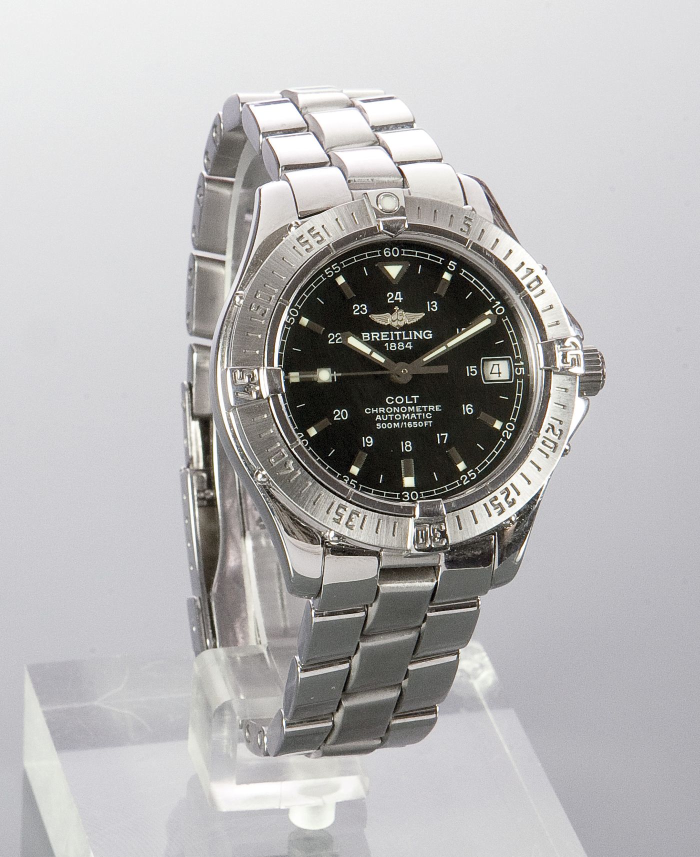 BREITLING Modello Colt, serie recente Diam. 37 Cassa in acciaio in tre corpi con fondo e corona a vite, lunetta incisa, girevole con cavaliere ai quarti, barcciale modello profesional; quadrante con indici applicati con finitura a cerchi concentrici Movimento automatico