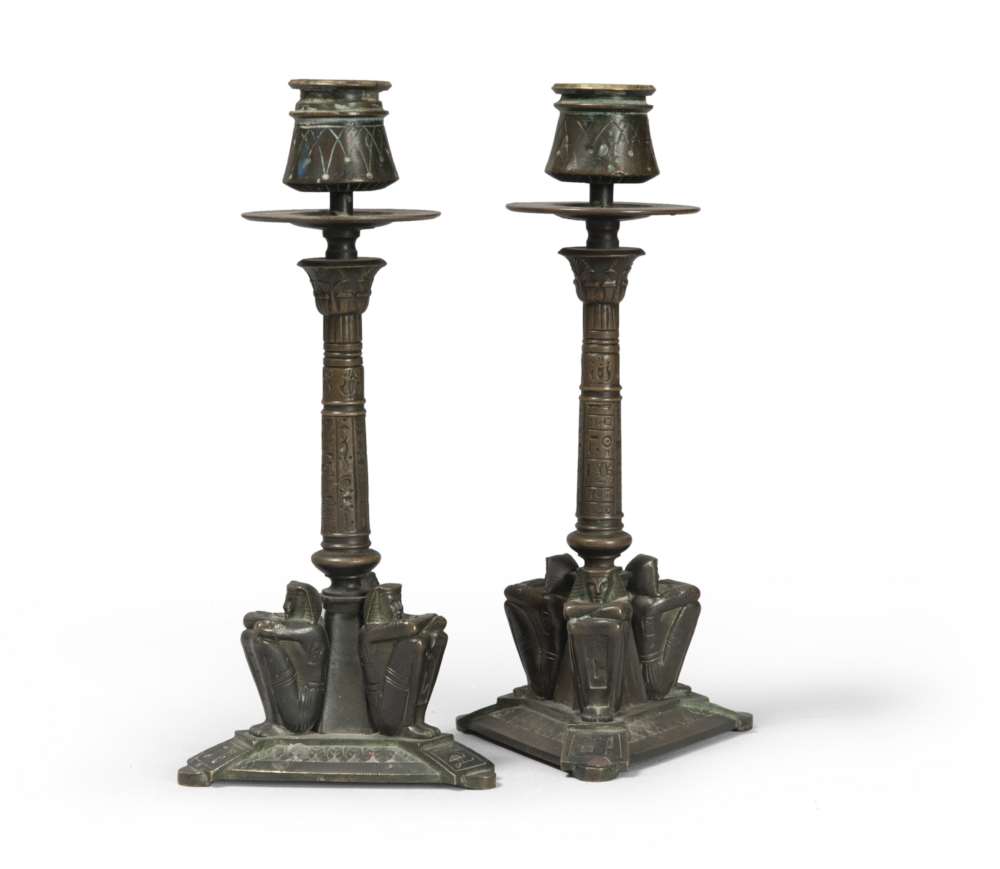 COPPIA DI CANDELABRI IN BRONZO, XX SECOLO con decori in stile egiziano. h. cm. 20.