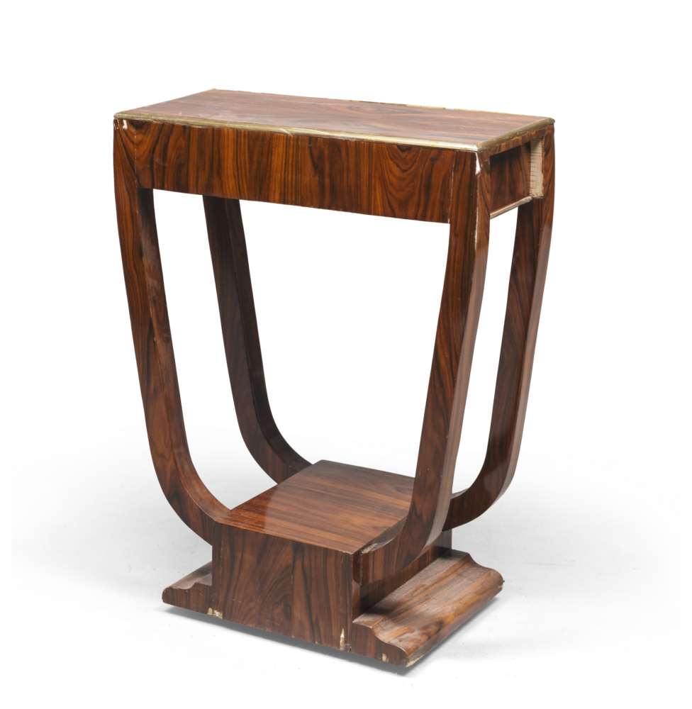 TAVOLINO IN PALISSANDRO, PERIODO DECÓ con piano rettangolare con bordo in metallo dorato. Gambe curvate, piede a mensola. Misure cm. 83 x 64 x 30.