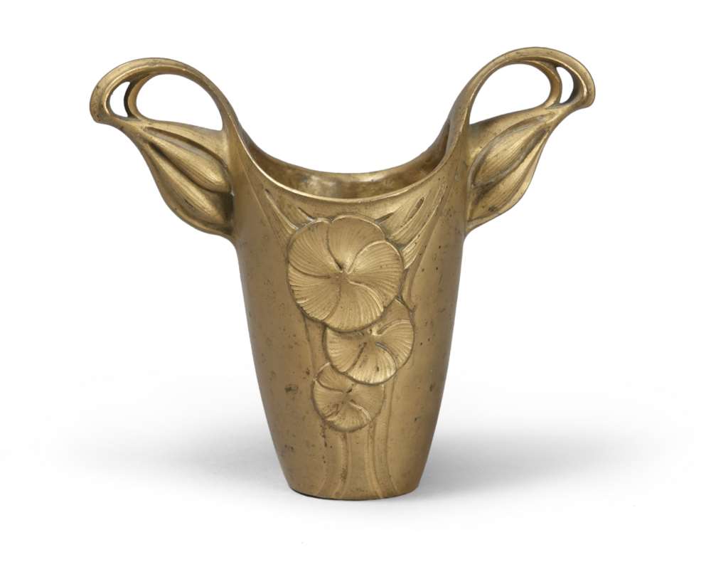 PICCOLO VASO IN BRONZO DORATO, STILE LIBERTY con decoro floreale al centro e...