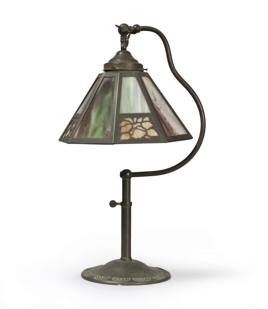 LAMPADA DA TAVOLO IN STILE LIBERTY, PRIMI '900 in metallo e vetri policromi con cappello ottagonale e motivi vegetali stilizzati sulla base. h. cm. 57. PROVENIENZA Collezione privata, Roma
