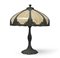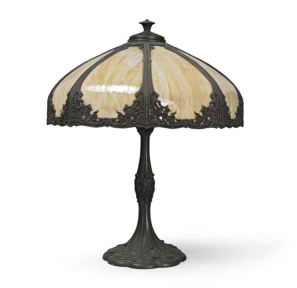 LAMPADA DA SCRIVANIA, STILE TIFFANY PRIMI '900 a tre luci con corpo in metallo e decorazioni floreali stilizzate. paralume in vetro calcedonio. Misure cm. 63,5 x 50. PROVENIENZA Collezione privata, Roma