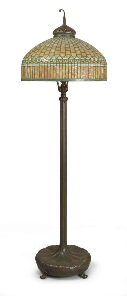 TIFFANY STUDIOS (New York 1880 - 1930) Curtain Border, 1900/1910 ca. Lampada da terra con paralume in vetro piombato e fusto in bronzo con decori floreali Fusto cm. 200 x 48 Paralume Ø cm. 58 Timbro 'Tiffany Studio New York 878', sulla base e all'intern