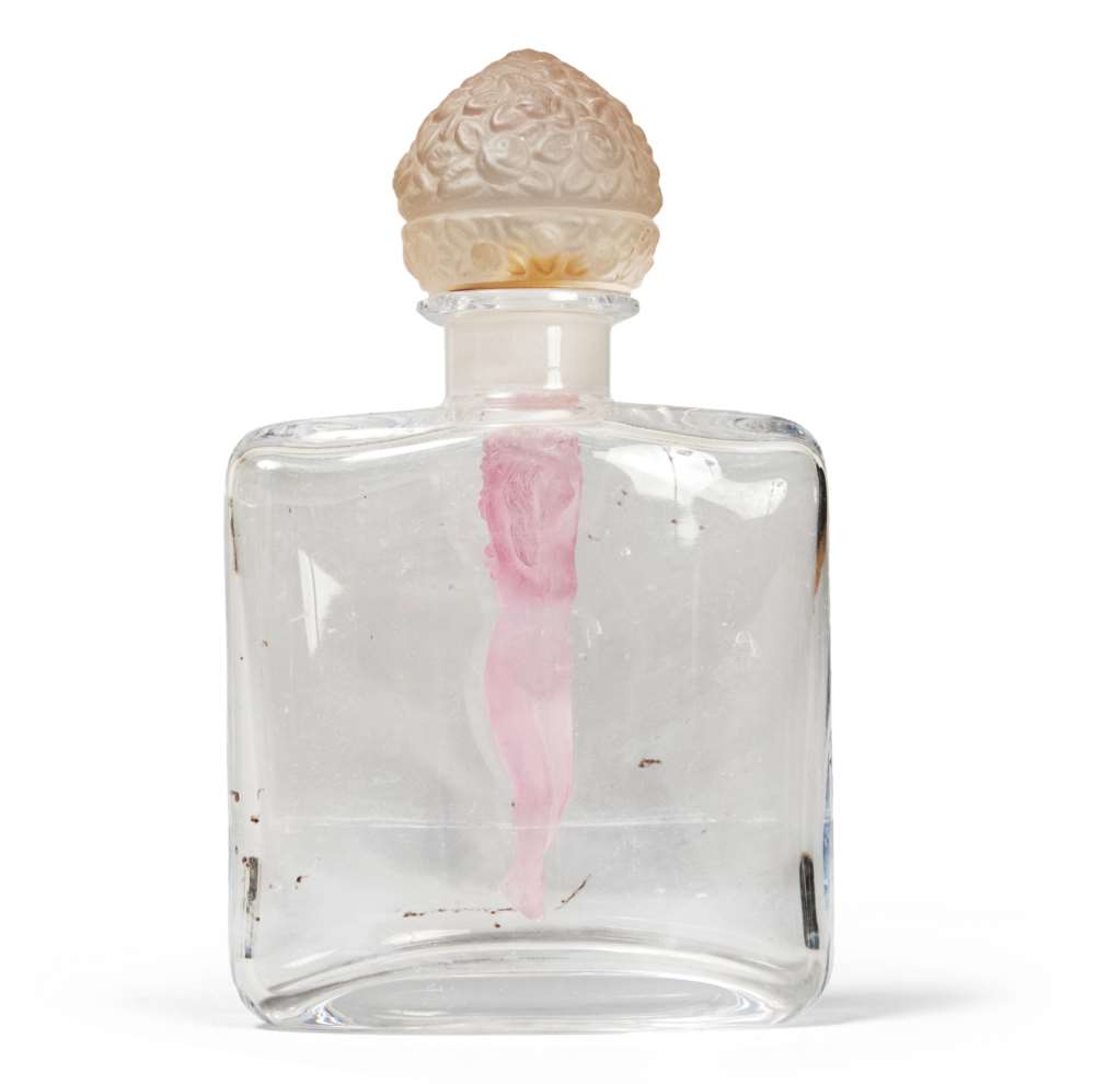 BOTTIGLIA PORTAPROFUMO IN VETRO, XX SECOLO con tappo in vetro satinato decorato con rose e figura di donna in vetro satinato rosa. Firma 'Locchi' all'acido, sulla base della bottiglia. Misure, cm. 23 x 15 x 5.