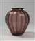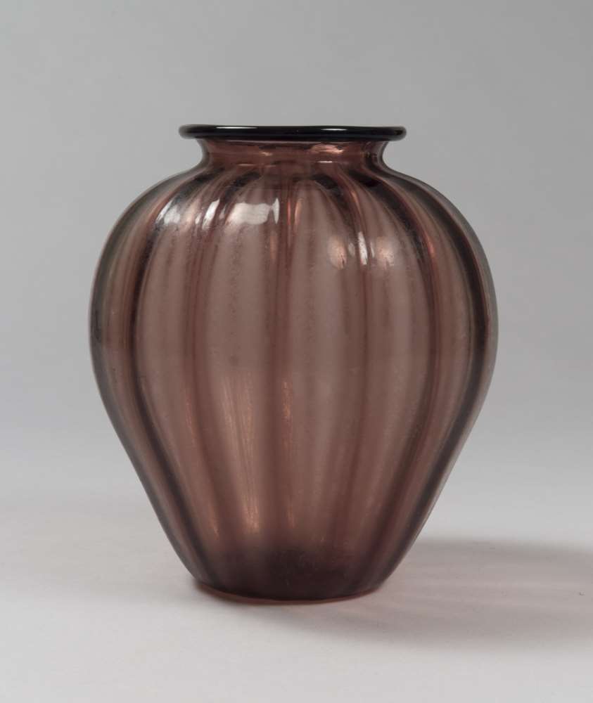 VASO IN VETRO SOFFIATO, MURANO PRIMI '900 a sagoma sferica costolata, con fondo color ametista. Misure cm. 25 x 20.