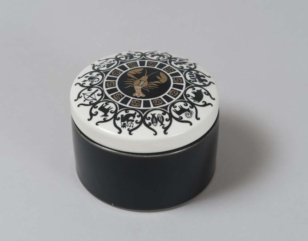 SCATOLA IN CERAMICA, PRODUZIONE ARABIA FINLAND con coperchio decorato a serigrafia con i segni dello zodiaco. Marca sotto la base. Misure cm. 6,5 x 10.