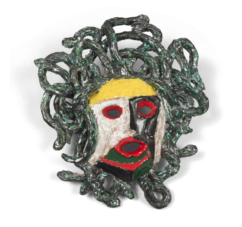 MASCHERA DI MEDUSA IN CERAMICA POLICROMA INVETRIATA, ANNI '50 con volto...
