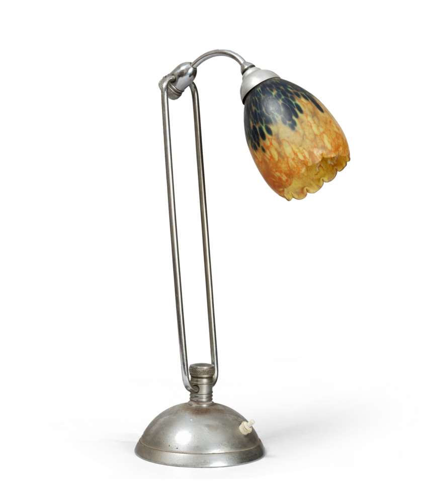 LAMPADA DA TAVOLO con fusto originale in metallo produzione francese 'Jumo' modello 610. Cappello in pasta di vetro arancio e blu del periodo Liberty. h. cm. 43. PROVENIENZA Collezione privata, Roma