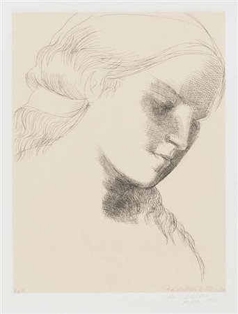 EMILIO GRECO (Catania 1913 - Roma 1995) Volto di donna, 1981 Litografia, ex. PA Misure della lastra, cm. 24 x 18,5 Firma, data e dedica in basso a destra Timbro a secco in basso a destra