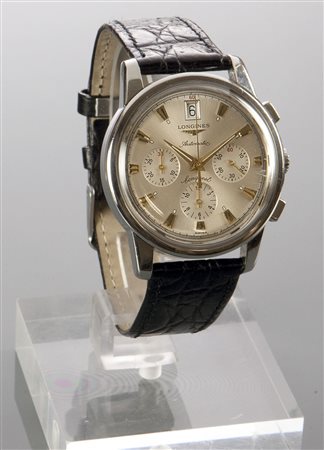 LONGINES Modello Conquest, cronografo a tre contatori, anni '70 Diam. 39 Cassa in acciaio in tre corpi con fondo a vite e pulsanti rettangolari; quadrante argenté con indici geometrici applicati, datario al 12, secondi continui ad ore 3, contatore 30 minuti ad ore 9, ore al 6 Movimento automatico