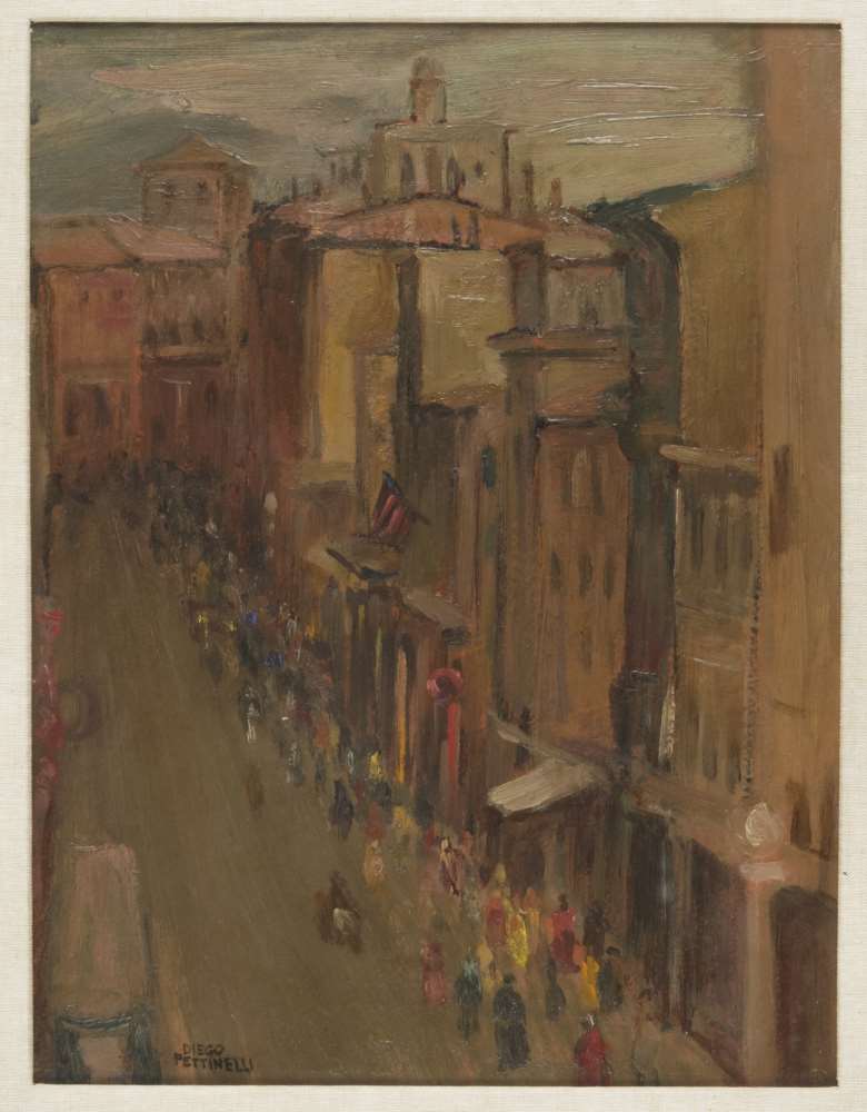 DIEGO PETTINELLI (Matelica 1897- Roma 1989) Via Orefici, 1929 Olio su cartone, cm. 43 x 32 Firma in basso a sinistra Firma, titolo e data al retro PROVENIENZA Collezione privata, Roma