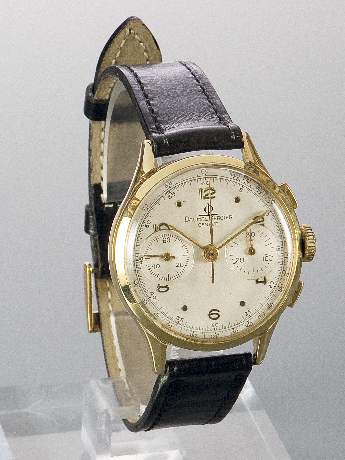 BAUME & MERCIER Cronografo a due contatori, anni '50, Diam 37 Cassa in oro...
