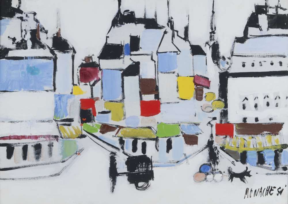 SANTE MONACHESI (Macerata 1910 - Roma 1991) Paesaggio di Parigi con organetto di barberia e palloncini, inizi anni '60 Olio su tela, cm. 50 x 70 Firma in basso a destra Autentica su foto dell'Archivio Sante Monachesi, n. MNCLCUFB8847HB
