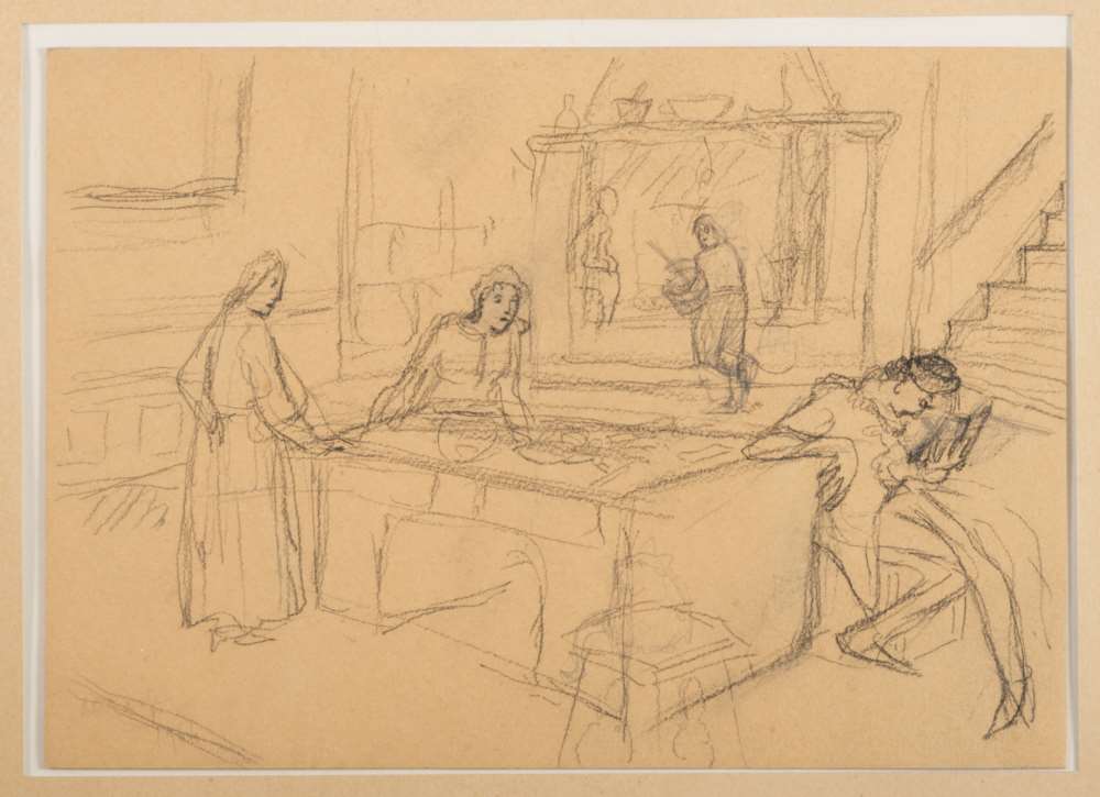 PITTORE ITALIANO DEL NOVECENTO Figure in interno di cucina Matita su carta, cm. 22 x 31 Non firmato