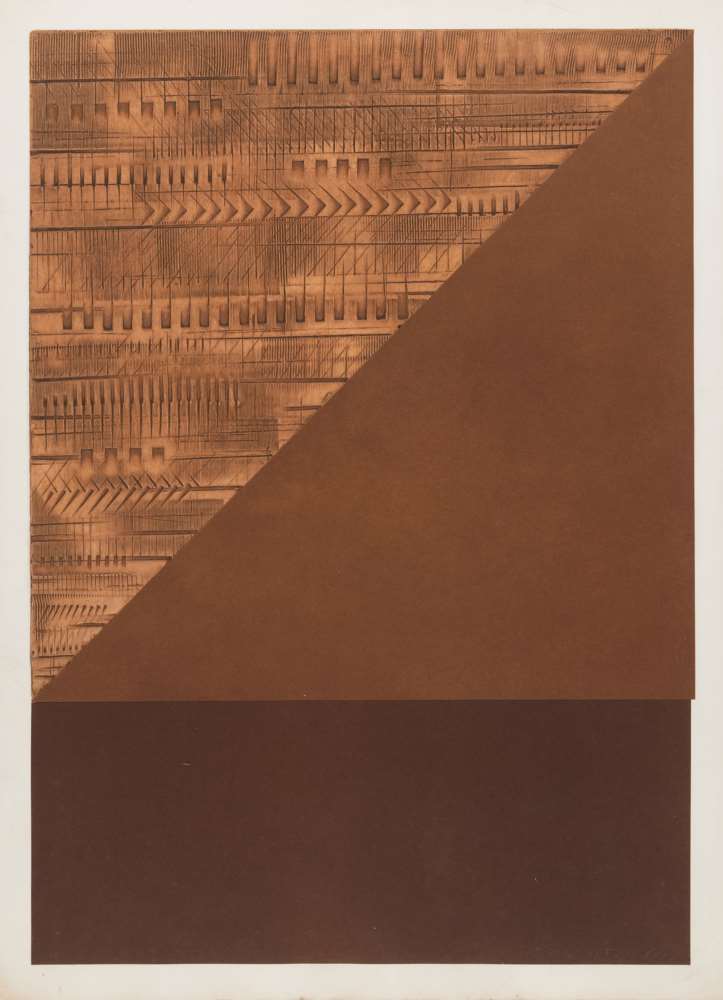 ARNALDO POMODORO (Morciano di Romagna 1926) Senza titolo, 1970 Incisione, ex. 3/100 Misure del foglio 75 x 45 Firma in basso a destra Timbro a secco '2RC', in basso a sinistra