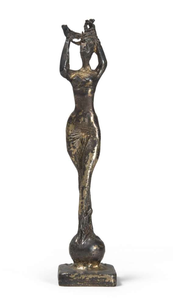 IORIO VIVARELLI (Fognano 1922-2008) Figura, fine anni '70 Scultura in argento dorato, ex. 13/250, h. cm. 18 Firma incisa sulla base Custodia originale Certificato di garanzia allegato