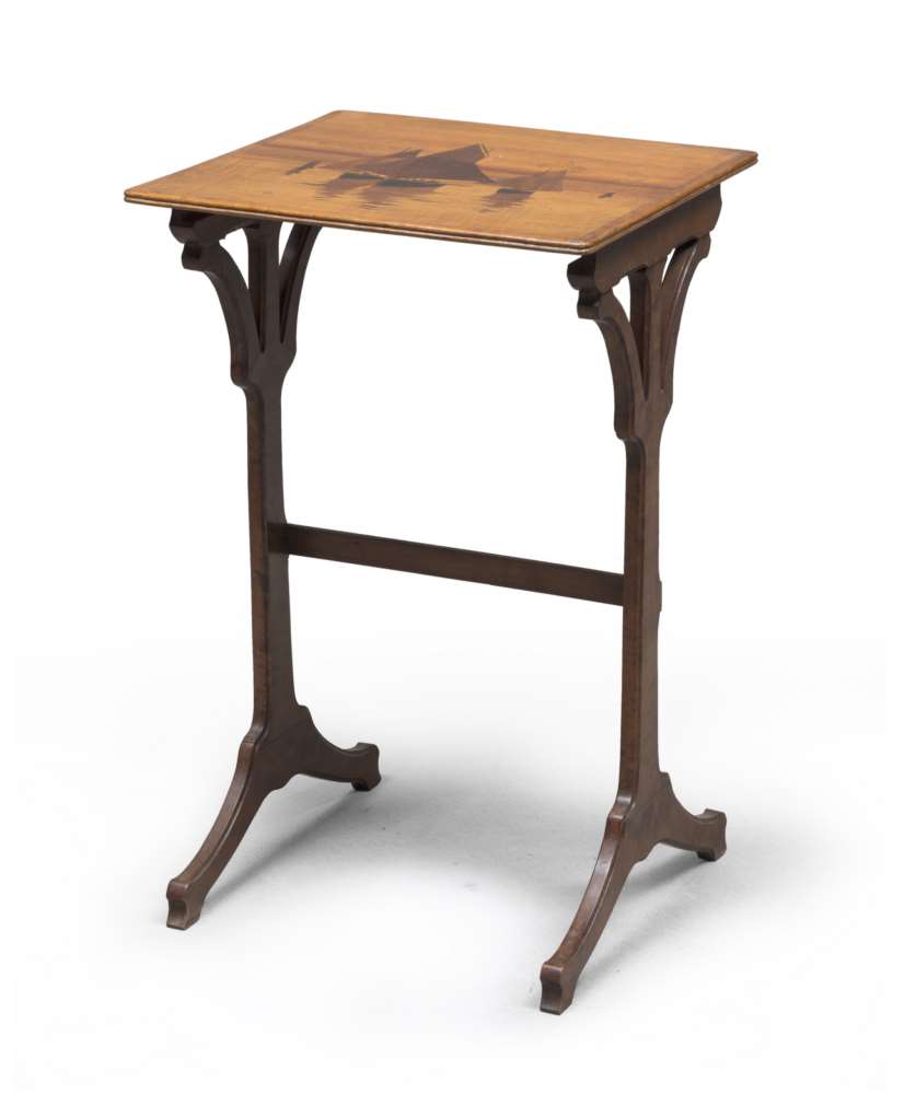 TAVOLINO IN ACERO, EMILE GALLÈ 1910 CIRCA con ripiano intarsiato in legni di frutto con decoro ad imbarcazioni. Ripiano inferiore con gambe a sciabola. Firma sul piano in basso a destra. Misure cm. 68 x 42 x 38.
