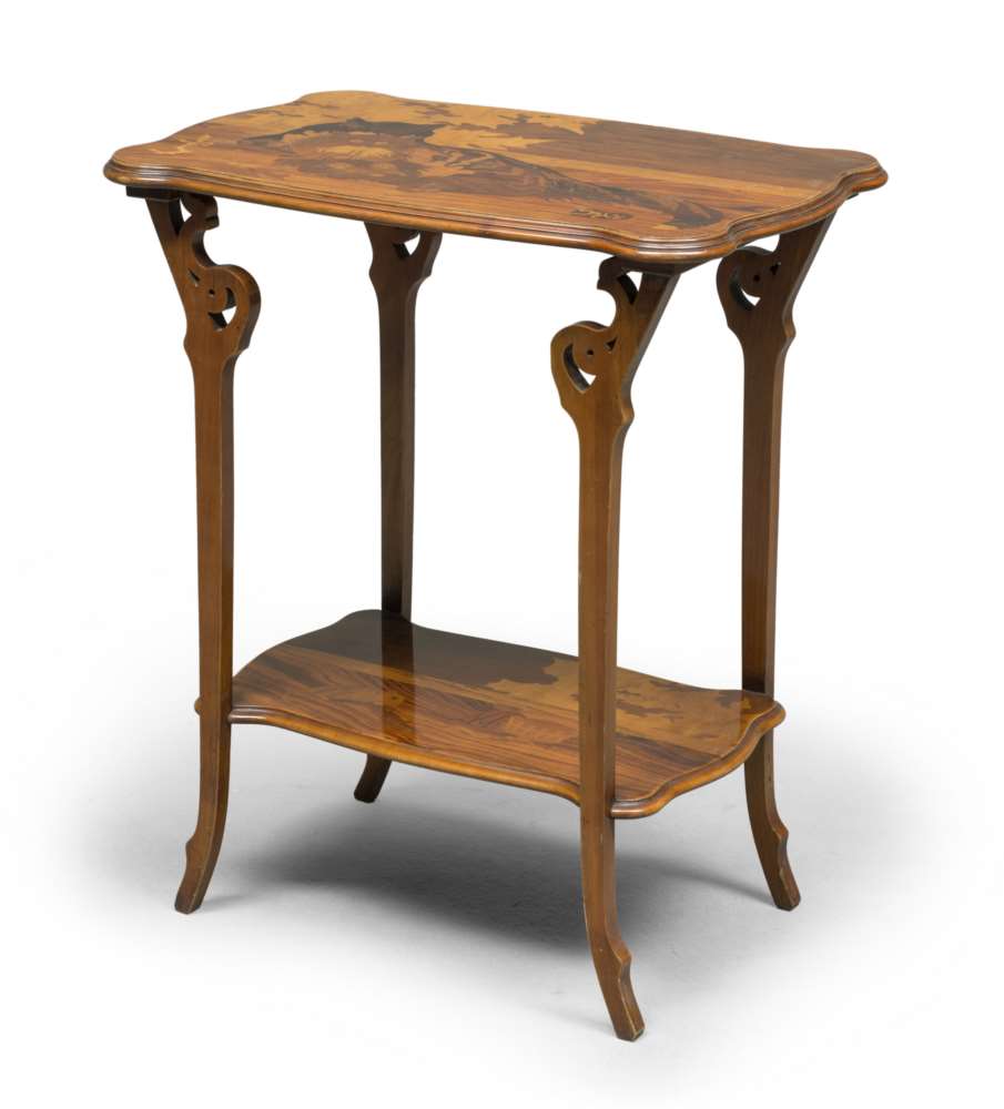 TAVOLINO IN ACERO, EMILE GALLÈ 1910 CIRCA con ripiano intarsiato in legni di frutto con figure di animali. Ripiano inferiore con gambe a sciabola. Firma sul piano in basso a destra Misure, cm 76 x 68 x 43.