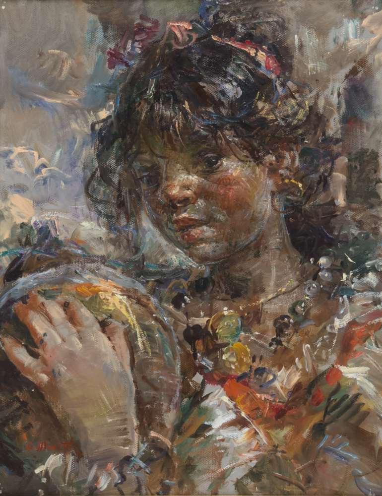 GIACOMO MORETTI (Napoli 1939) Fanciulla Olio su tela, cm. 45,5 x 35 Firma in basso a sinistra