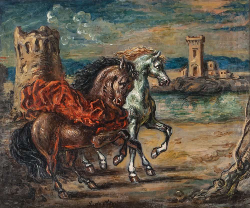 GIORGIO DE CHIRICO (Volos 1888 - Roma 1978) Due cavalli in un paese, fine anni '50 Olio su tela, cm. 50 x 60 Firma in basso al centro PROVENIENZA Collezione privata, Roma 'Insieme con Achille, a Troia, giunsero anche i cavalli immortali Balìo e Xanto