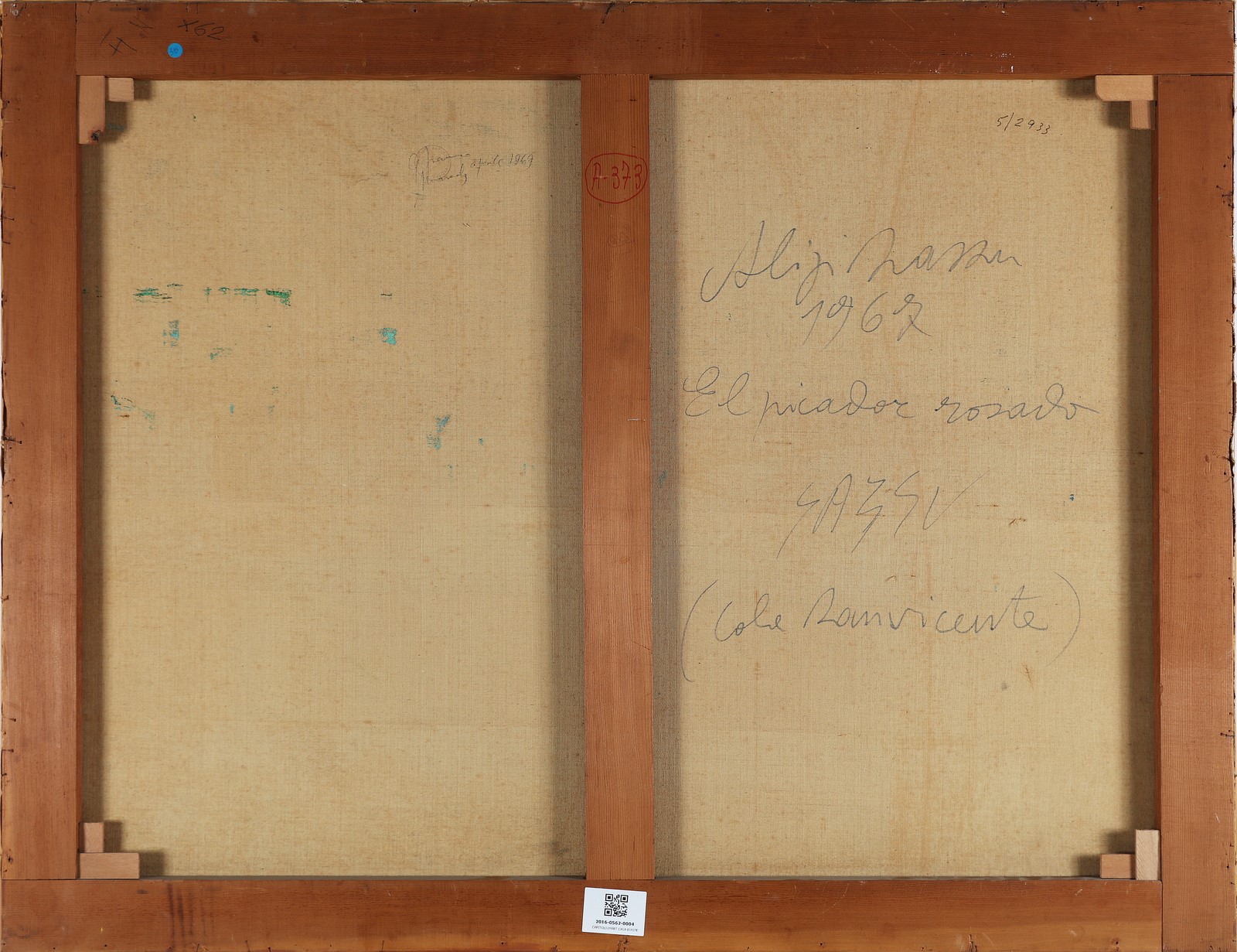 SASSU ALIGI (1912 - 2000) El picador rosado. . 1967. Olio su carta intelata. Cm 106,00 x 83,00. Firma in basso a destra. Al retro firma, anno e titolo. Autentica su fotografia a cura dell'artista. Pubblicazione: Catalogo generale della pittura, Volume secondo 1963-2000, n. 1967, p. 50, Mondadori Electa, Milano. . Cornice presente