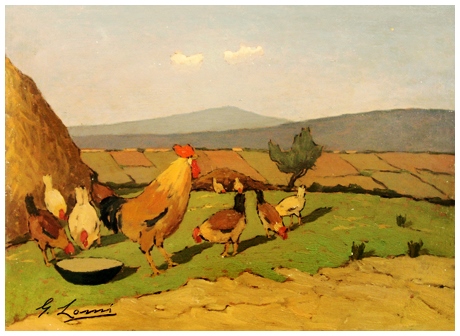 GIOVANNI LOMI Ardenza 1889 – Ardenza 1969 Galli al sole Olio su faesite 30 x 40. Firma in b. a s., titolo sul verso. Autentica Archivio Lomi, Livorno su foto disponibile a richiesta. B.A.: 850