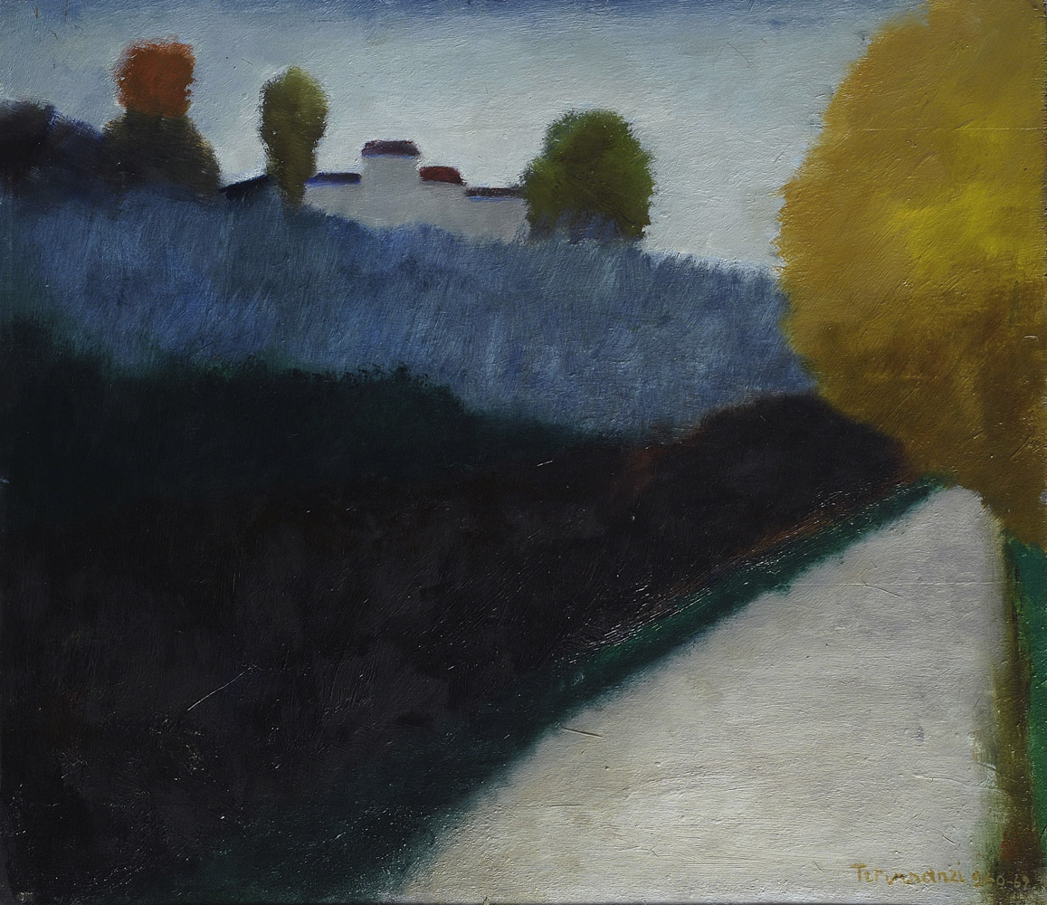 Nino Tirinnanzi, Greve in Chianti 1923 - 2002, Paesaggio, 1960-62, Olio su tavola, cm. 35x40, Firma e data in basso a destra. Sul verso: timbro Galleria Santacroce, Firenze, Autentica dell'Artista su foto."