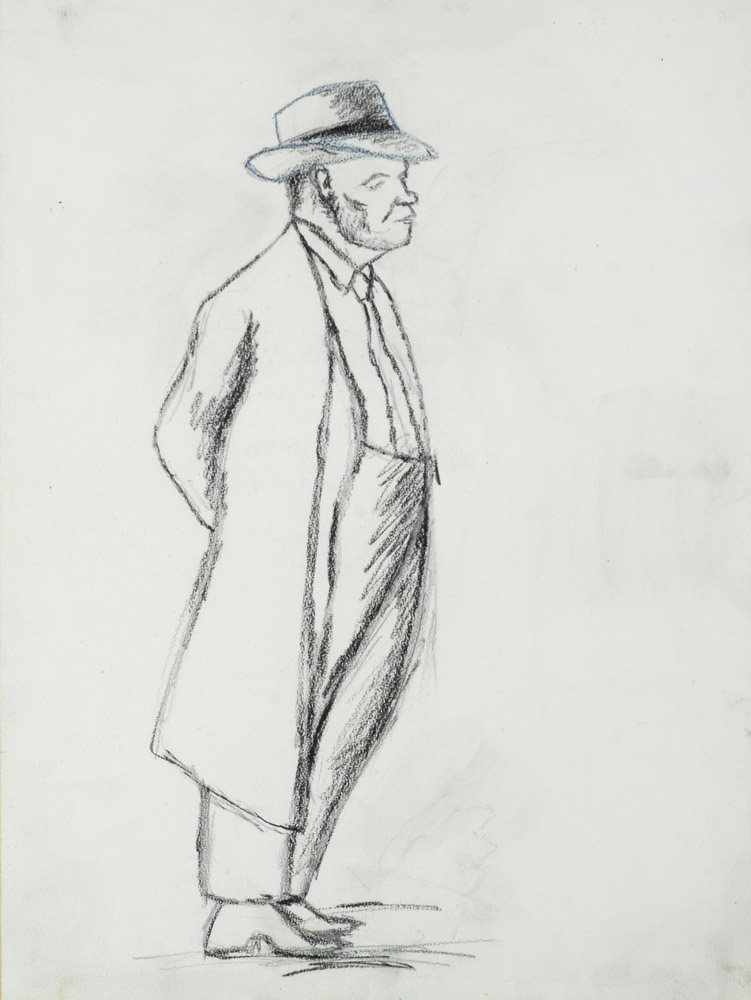 Ottone Rosai, Firenze 1895 - Ivrea 1957, Uomo con cappello, 1934, Carboncino su carta, cm. 51x38, Esposizioni: 1995-1996, Ottone Rosai, nel centenario della nascita, Palazzo Reale, Milano. Bibliografia: 1995, L. Cavallo, Ottone Rosai, nel centenario della nascita, Edizioni Mazzotta, p. 306.