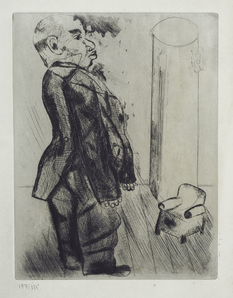 Marc Chagall, Vitebsk 1887 - Saint Paul de Vence 1985, Sobakevitch pres du fauteuil, 1923-1927, Acquaforte, mm. 278x213 (lastra), mm. 371x280 (foglio); es. 197/335, Dalla serie "Les Ames Mortes" di Nicolas Gogol edita nel 1948. Tiratura in basso a sinistra. Bibliografia: 1995, P. Cramer, Marc Chagall The Illustrated Books catalogue raisonnè, Patrick Cramer Ginevra, n° 17 pag 48 e illustrata pag. 52.
