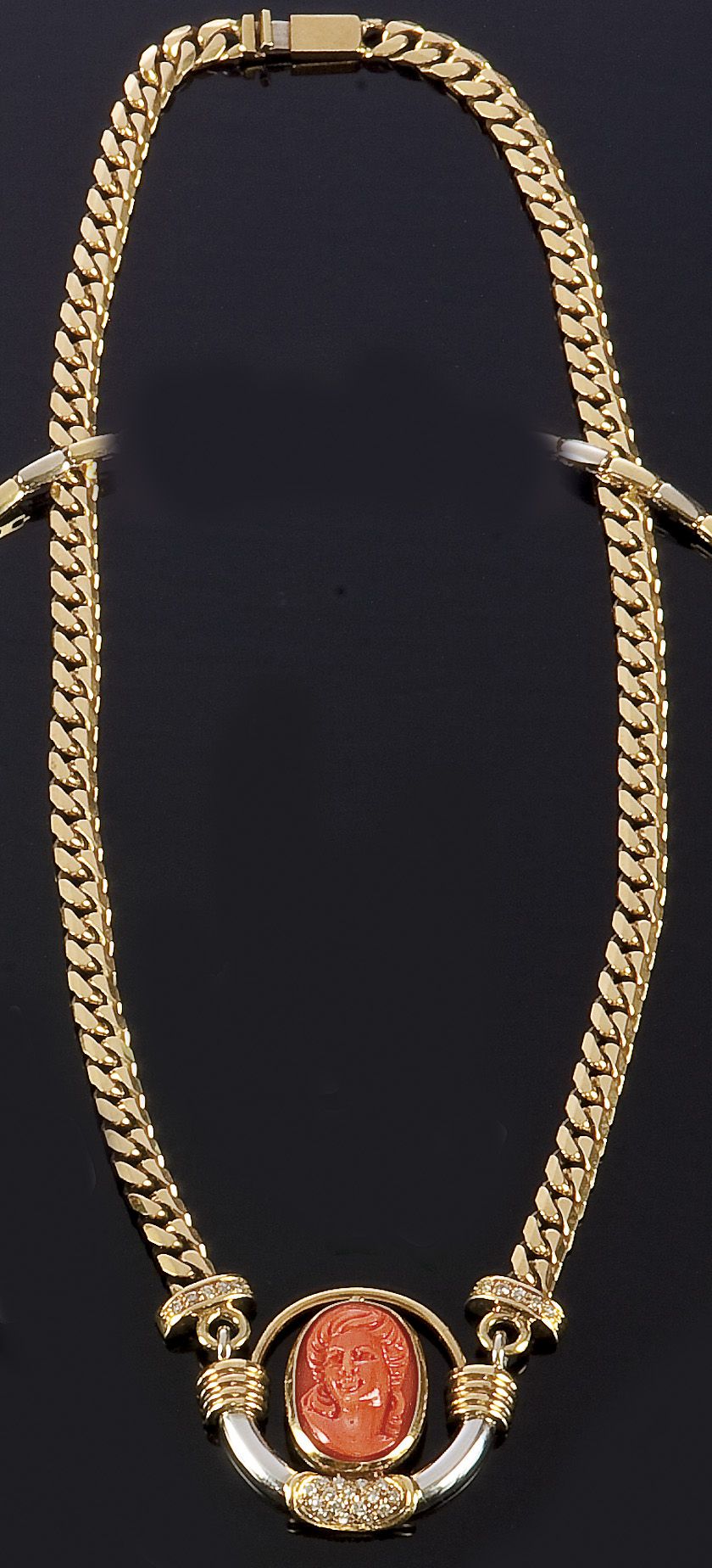 GIROCOLLO Girocolo in oro giallo lavorato a maglia, con al centro tondo in oro bianco e giallo trattenente un corallo giapponese inciso con volto femminile; inserto con piccoli diamanti taglio brillante rotondo per complessivi ct 0,50 ca Peso gr 57,4