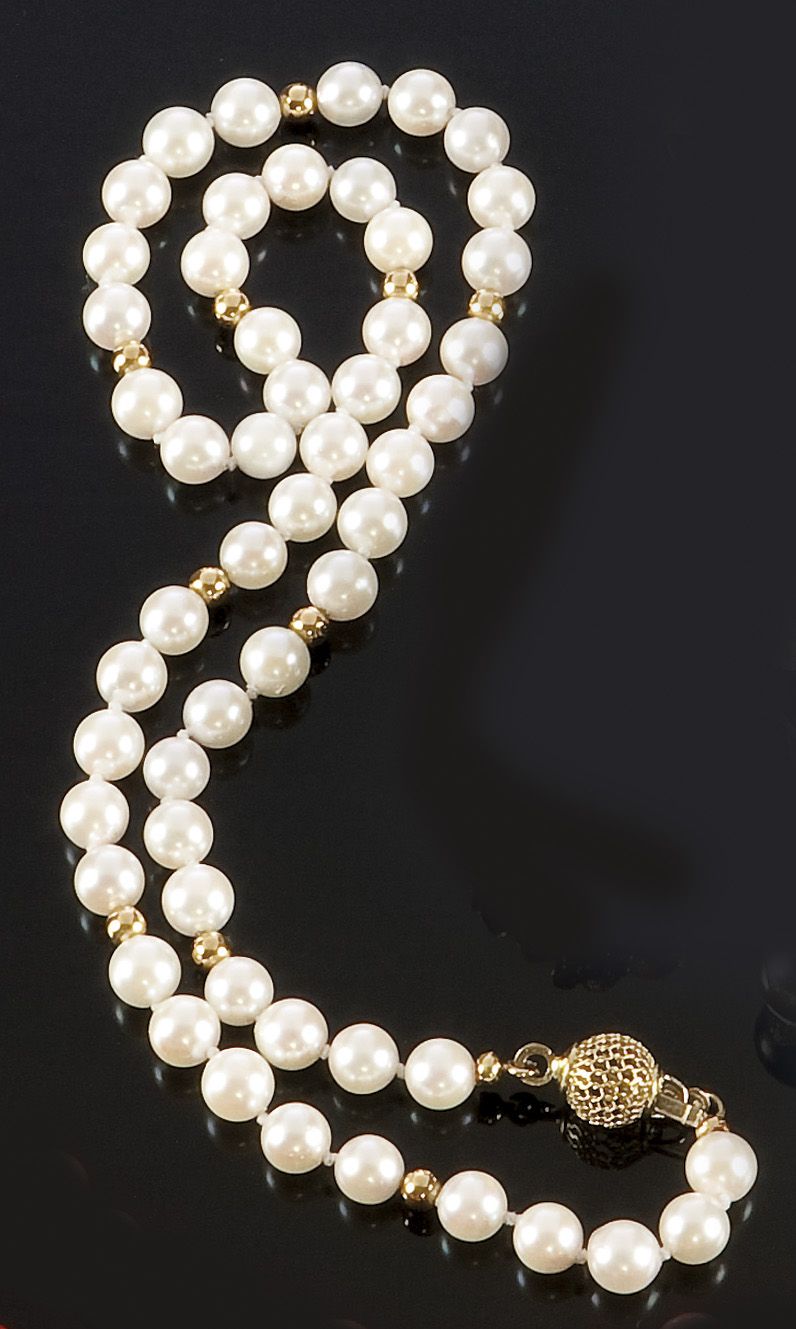 COLLANA DI PERLE Collana composta da un filo di perle dal diam. di mm 6,00 a 6,50 , intervallate da dieci piccole boules in oro giallo, chiusura in oro giallo Peso gr 22,46 Certificato di analisi R.A.G. n. G007N/12 mn ril il 7/02/2012