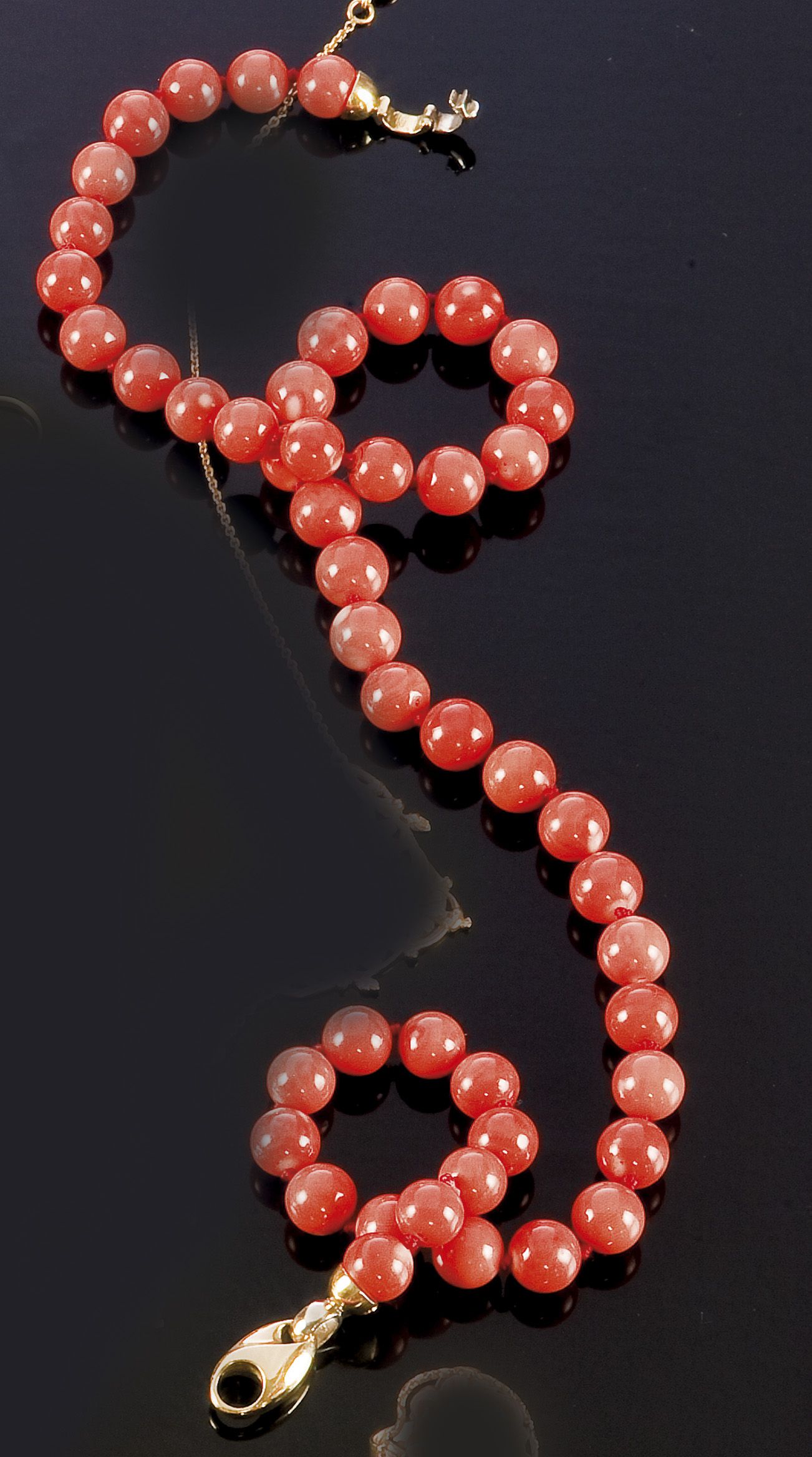 COLLANA DI CORALLO Collana di corallo giapponese composta da quarantotto boules a scalare dal diam. di mm 8,7 a 9,5 Chiusura in oro giallo Peso gr 58,28 Certificato di analisi R.A.G. n. C005N/12mn ril il 30/01/2012