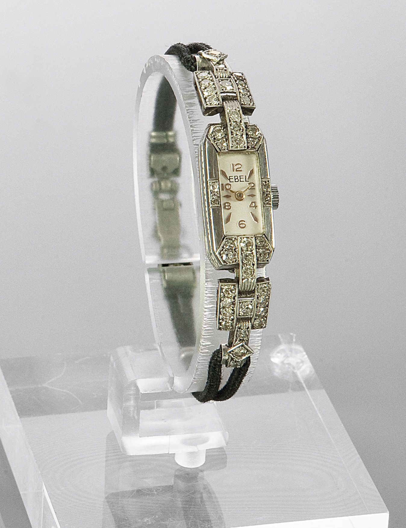 Orologio gioiello, anni '30 22,5x10,5 Cassa decò, in platino, in due corpi con incisioni lungo i fianchi, anse mobili, impreziosite da diamanti taglio brillante rotondo di vecchio taglio; quadrante con indici applicati in oro rosa Movimento a carica manuale
