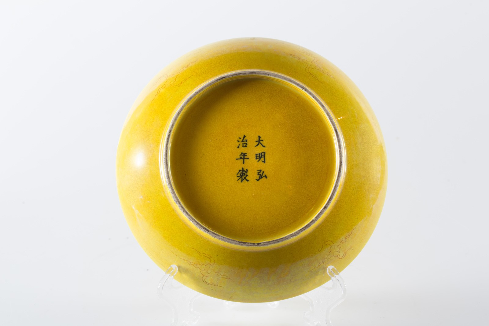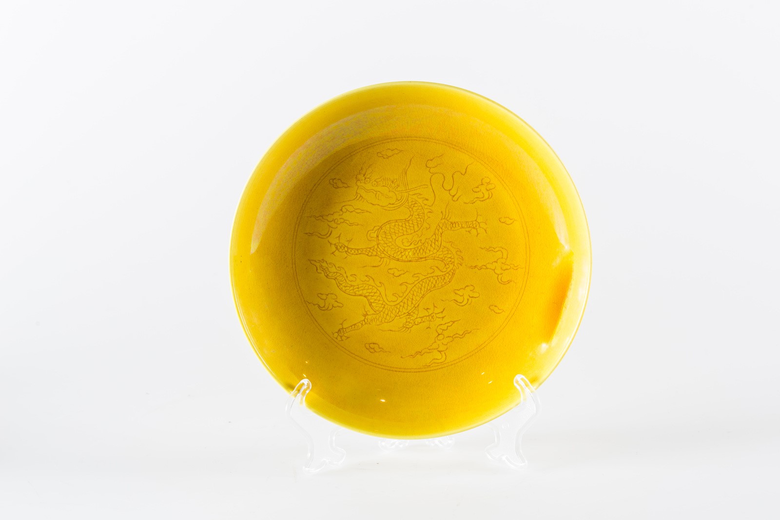 Arte Cinese A porcelain yellow glazed dish with incised decoration of a dragon chasing the flaming pearl and bearing a painted six characters Hongzhi mark at the base