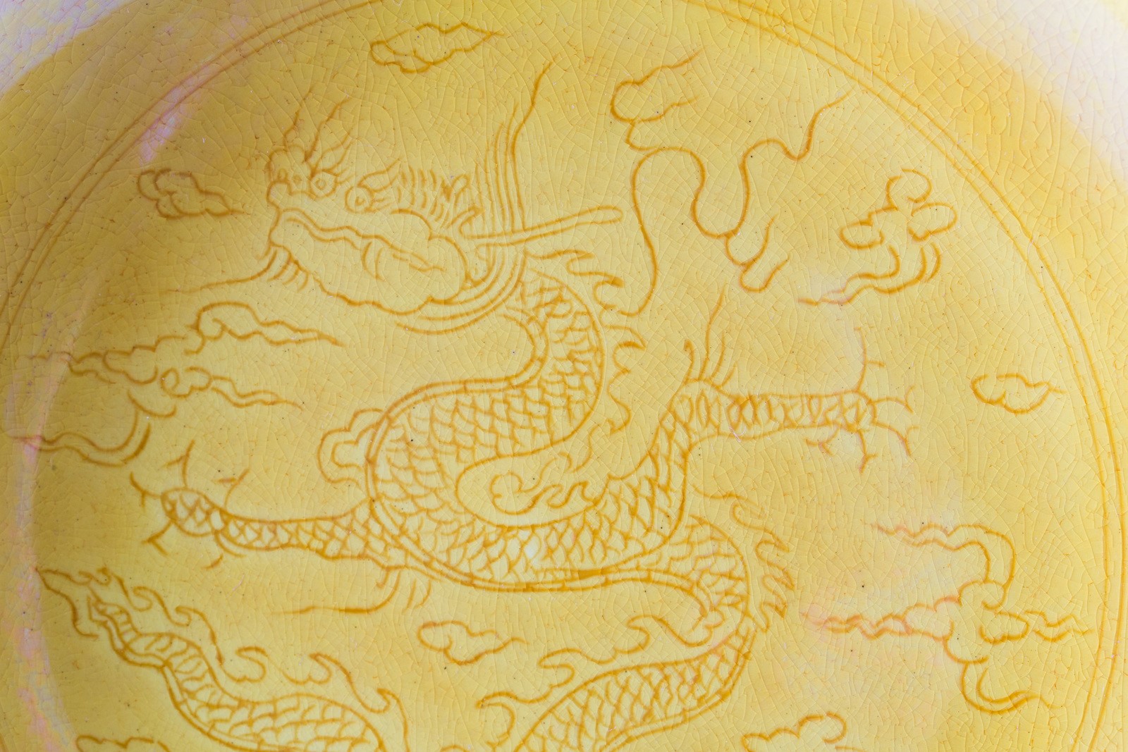 Arte Cinese Piatto in porcellana invetriata di giallo con decorazione incisa...