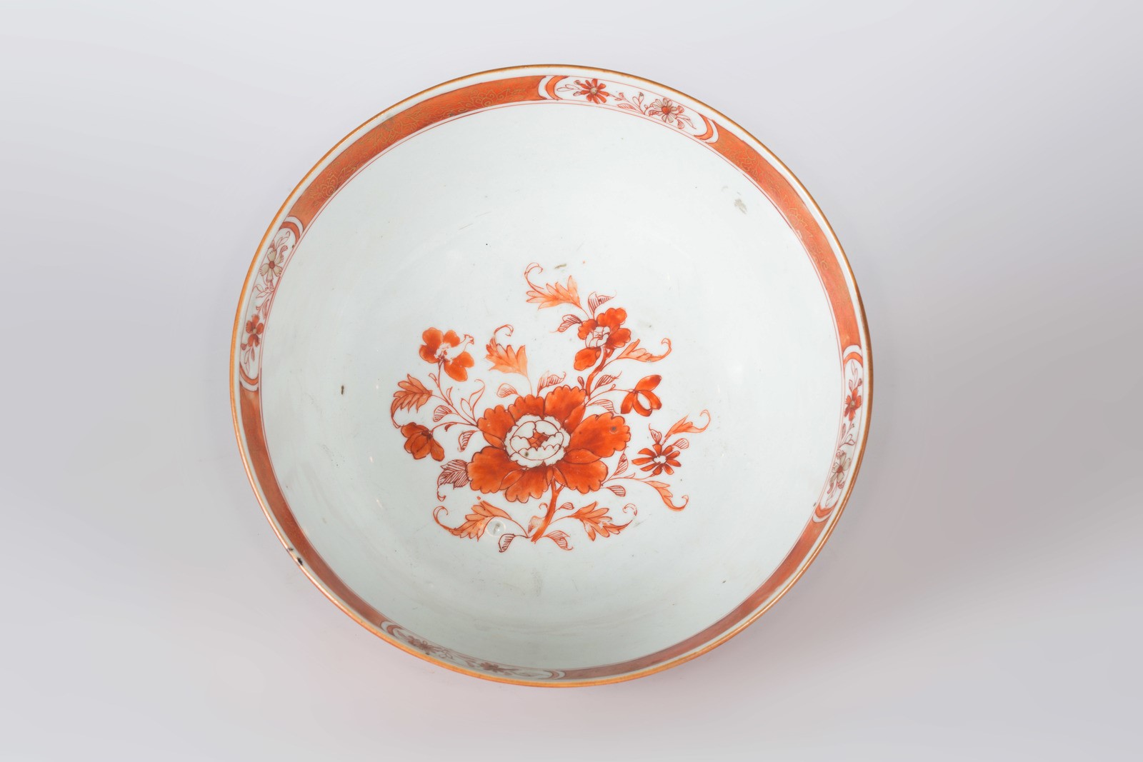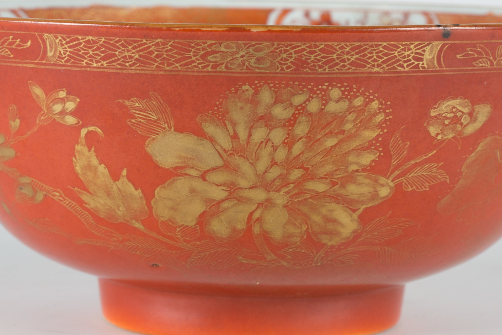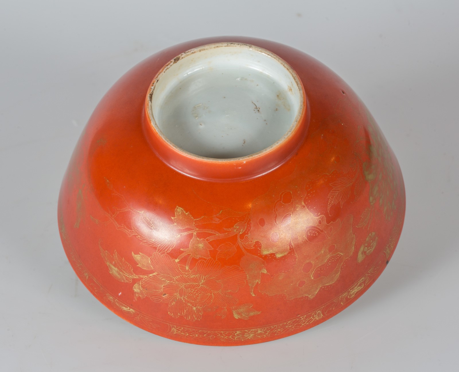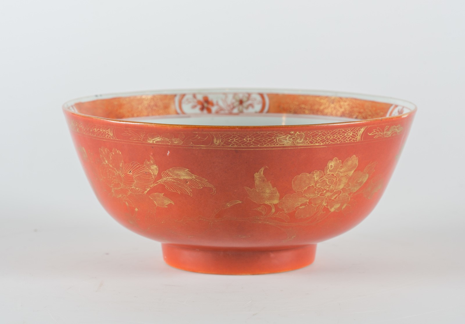 Cina, dinastia Qing. -. Cm 22,80 x 10,00. L'esterno presenta uniforme invetriatura color corallo decorata con fiori dorati. L'interno mostra una fascia ornamentale, appena sotto il bordo superiore, contenente fiori dorati su fondo rosso e quattro cartigli con motivo floreale dipinto in rosso con profili dorati; fiore sul tondo centrale.