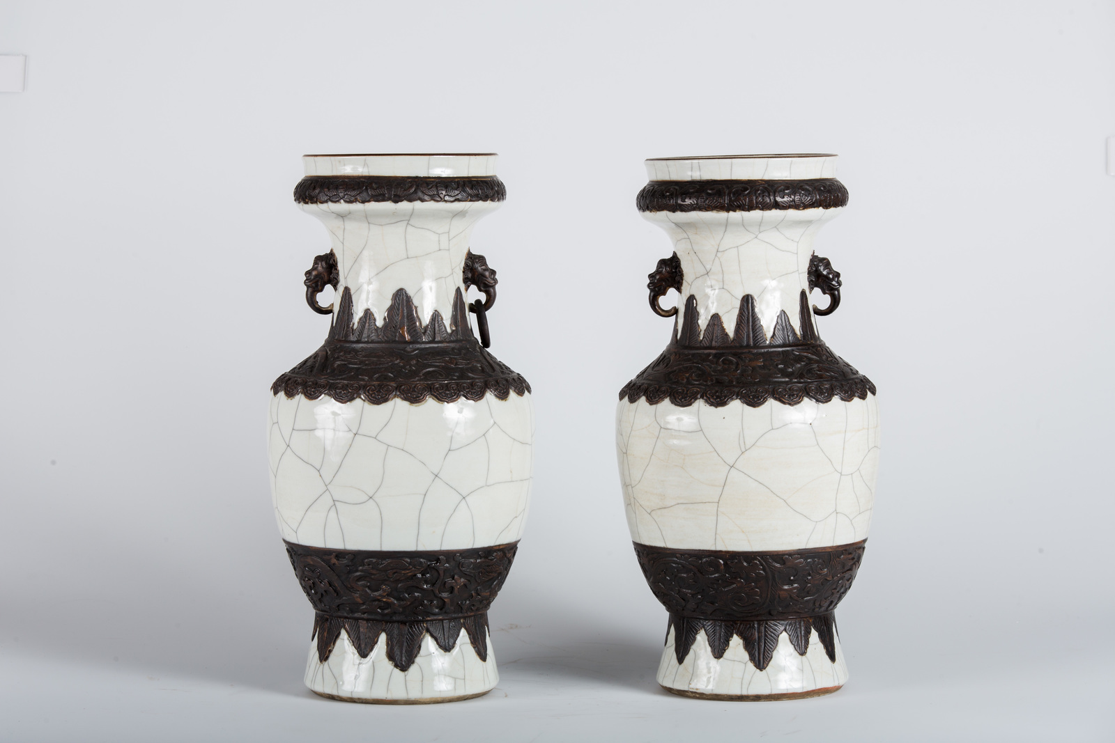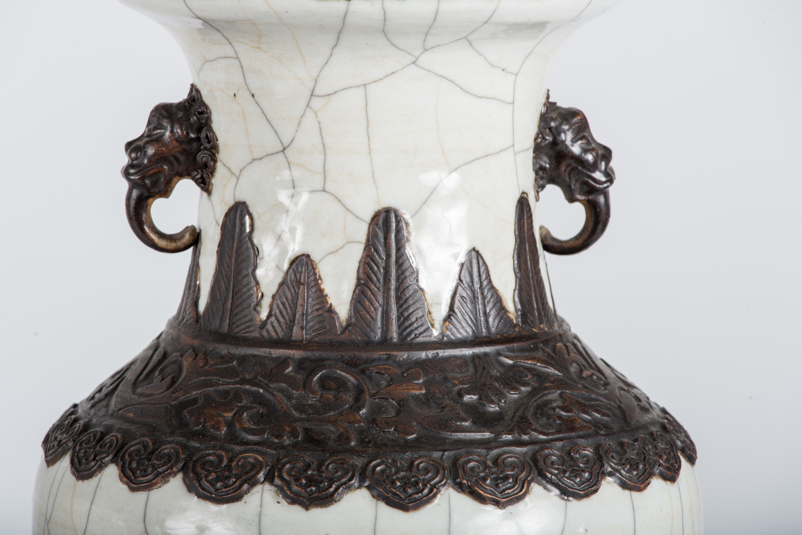 Cina, dinastia Qing, XIX secolo . -. Cm 45,00. Coppia di vasi a balaustro decorati con fasce metalliche contenenti dragoni, teste di ruyi ed elementi vegetali. Le parti invetriate presentano un'imitazione della caratteristica invetriatura Guan.
