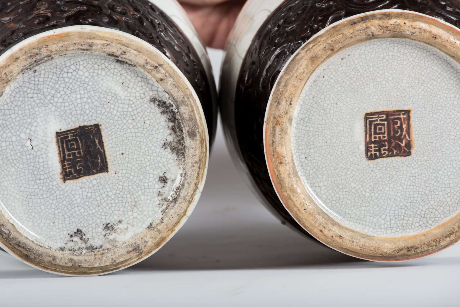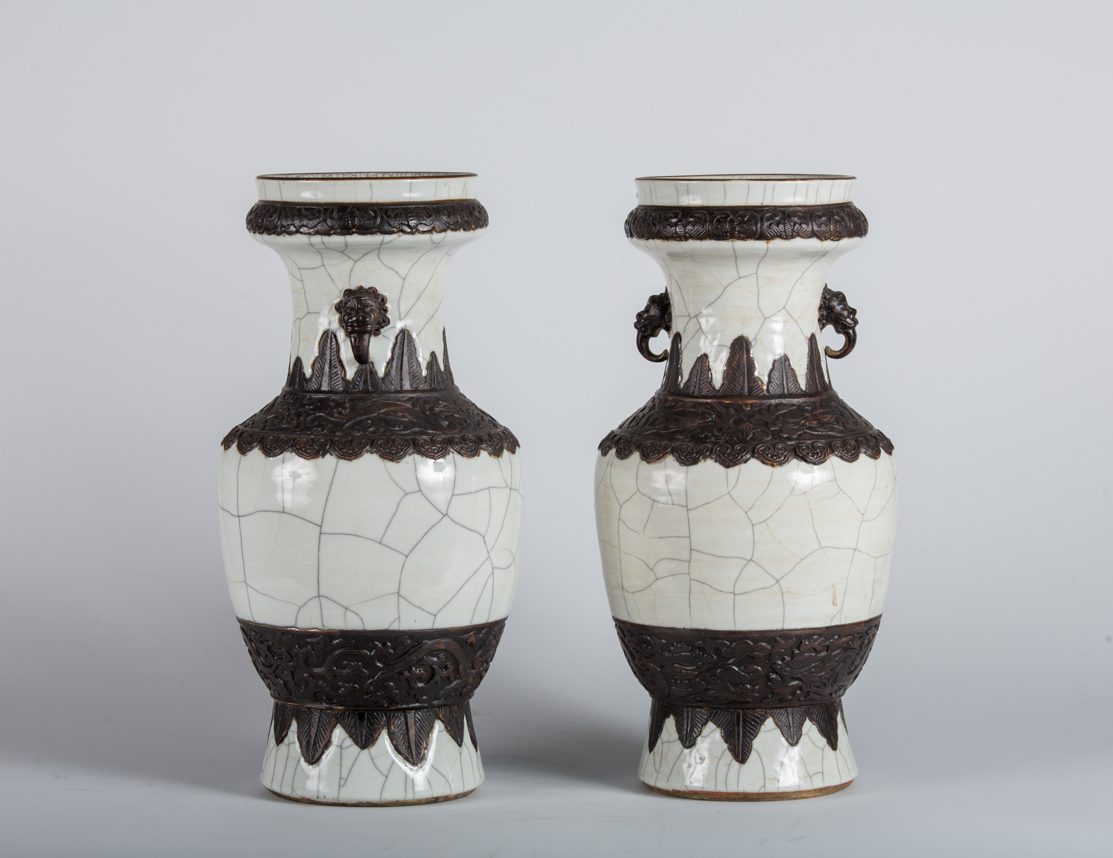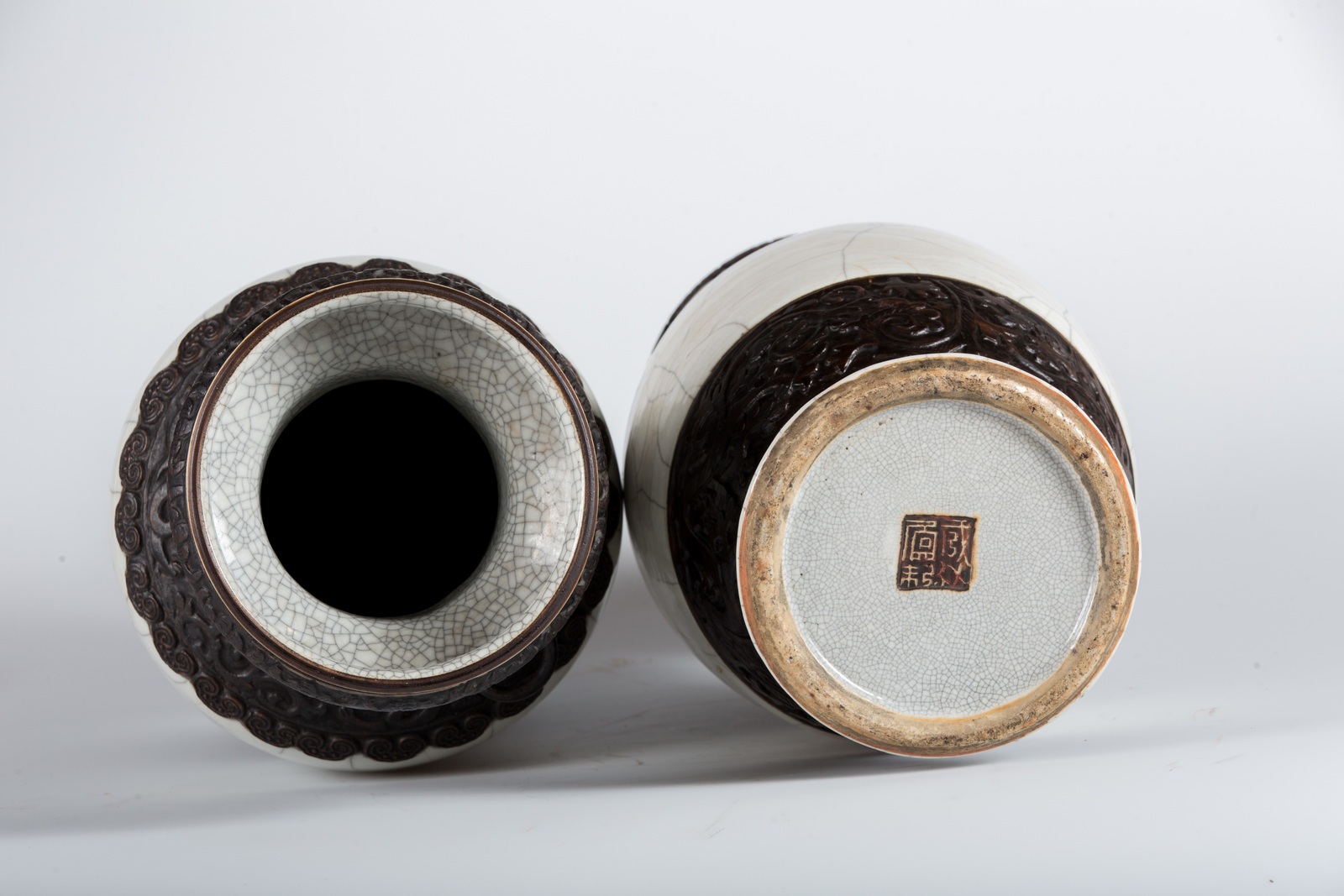 Arte Cinese A pair of Nankin vases with Guan imitation decor on the body and bearing a mark at the base