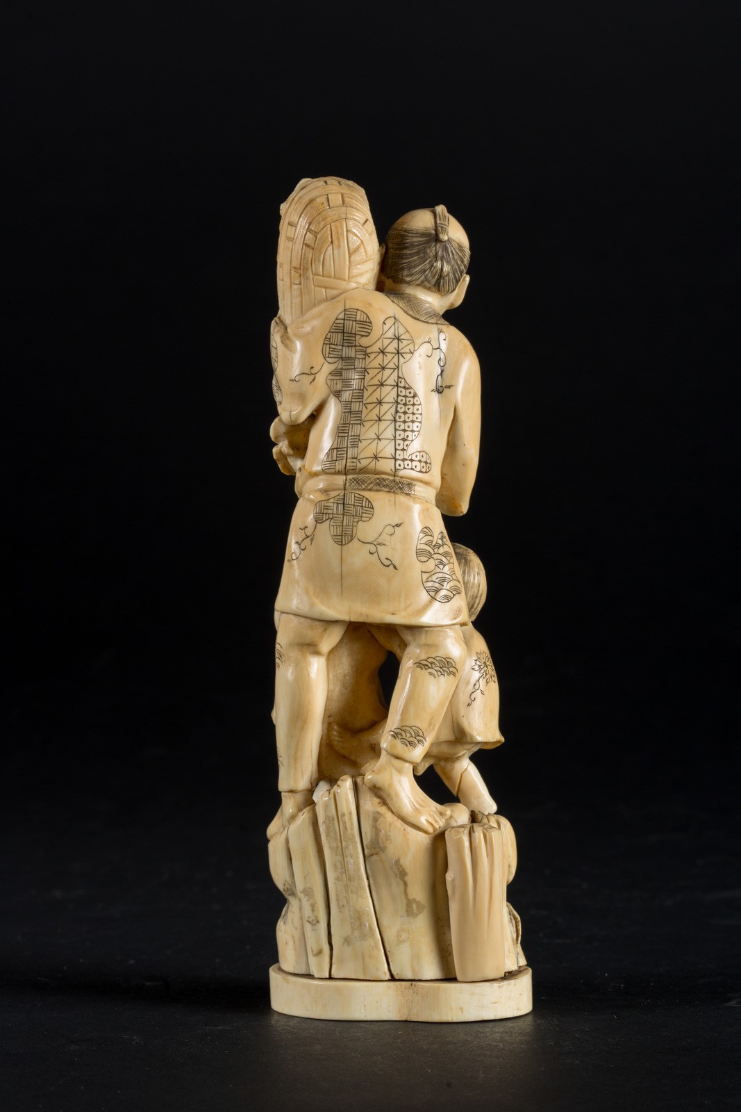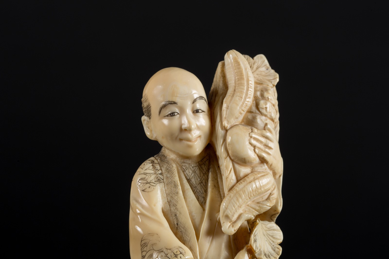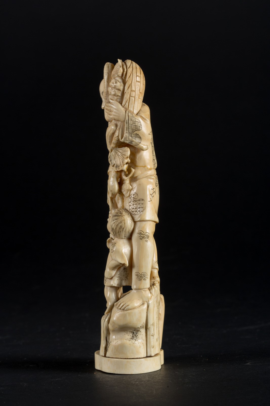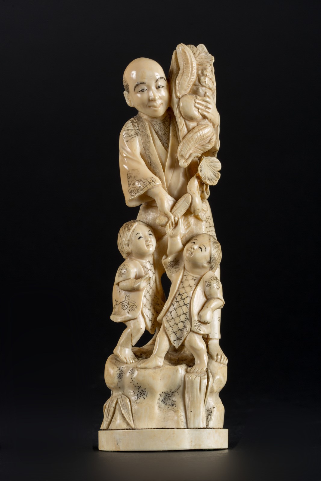 Arte Giapponese Okimono in avorio raffigurante un anziano con due bambini