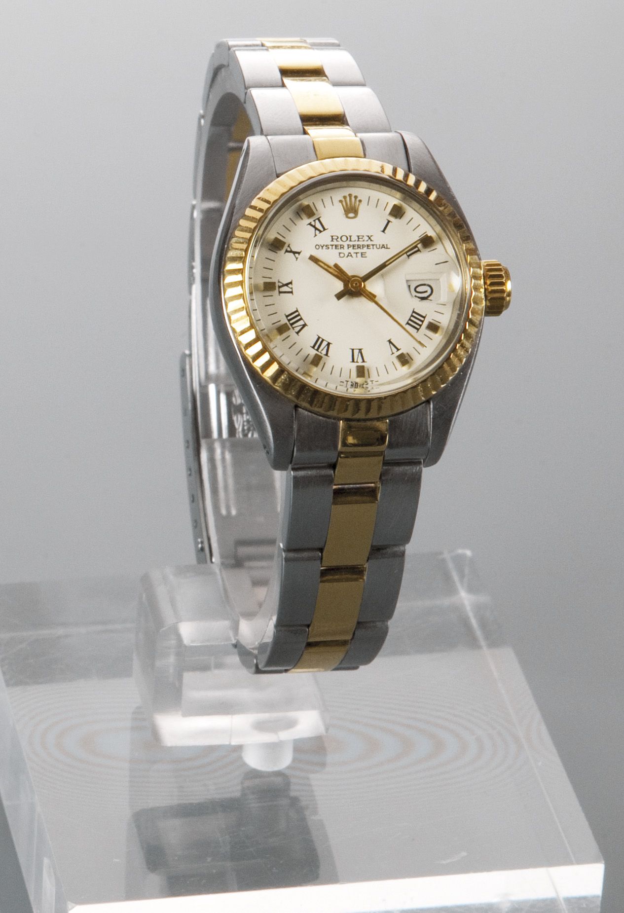 ROLEX Oyster Perpetual Date, misura lady, anni '70 Diam. 26 Cassa in acciaio e oro, in tre corpi con fondello e corona a vite; quadrante con indici applicati e numeri romani serigrafati, bracciale Oyster Movimento automatico