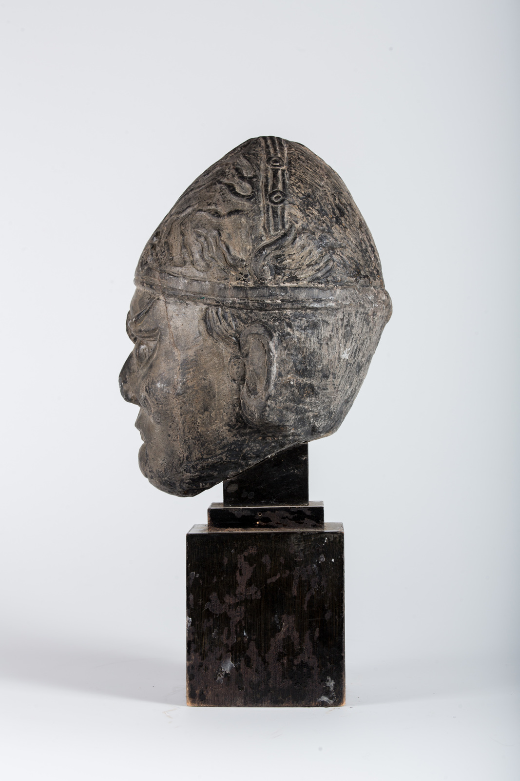 Cina, dinastia Yuan/Ming. -. Cm 22,00 x 46,00. Testa in pietra raffigurante probabilmente un guardiano caratterizzato dall'espressione severa e dall'alta capigliatura fiammeggiante.