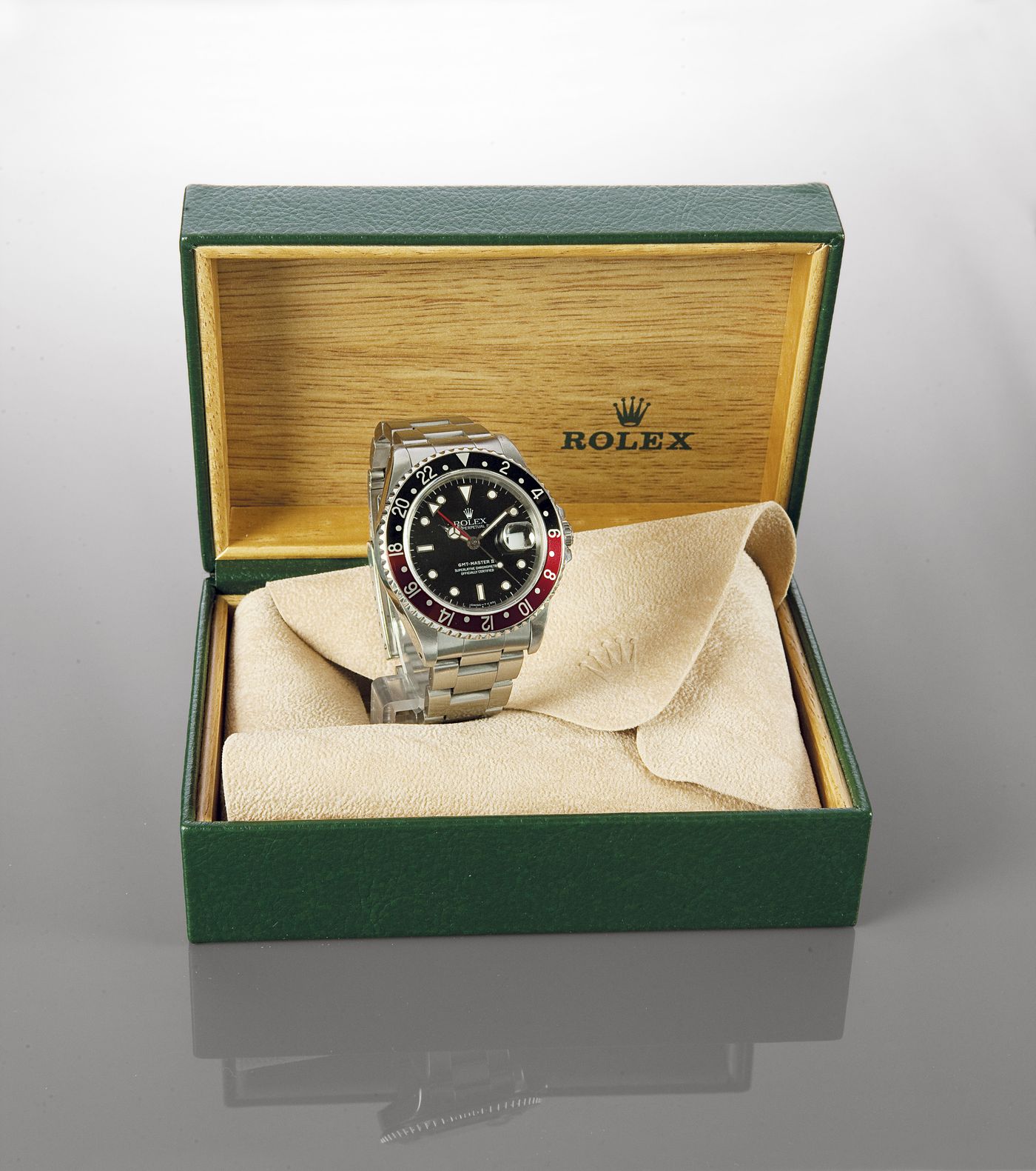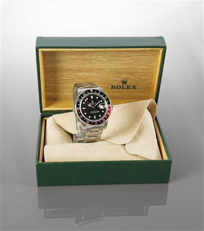 ROLEX GMT MASTER Oyster Perpetual GMT Master II, 1989, ref. 16710 Diam. 40 mm Cassa oyster in acciaio in tre corpi con fondo e corona a vite, lunetta girevole serigrafata con indicazione 24 ore. Bracciale oyster. Quadrante con indici applicati, lancetta supplementare con funzione GMT (Greenwich Mean Mean Time), per la lettura di un secondo fuso orario Movimento automatico calibro 3185