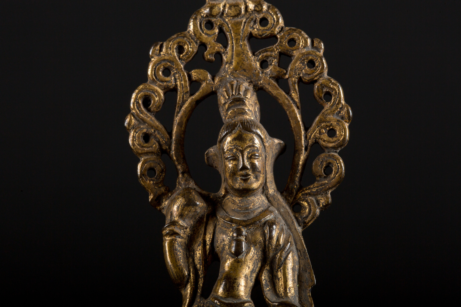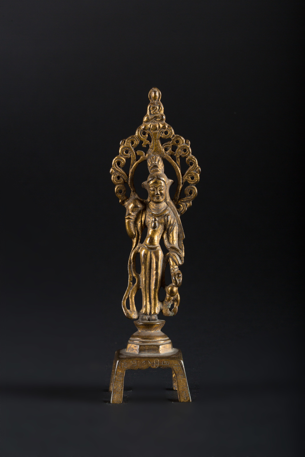 Arte Cinese A gilt bronze statue of Padmapani or Buddha on a raised base bearing inscriptions