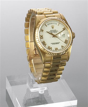 ROLEX Oyster Perpetual Day Date, 1997, ref. 18238 Diam. 36 Cassa in oro giallo in tre corpi con fondo e corona a vite. Lunetta godronata. Bracciale president con chiusura a scomparsa; quadrante con numerazione romana applicata indicazione giorno ad ore 12 e data ad ore 3 Movimento automatico calibro 3155