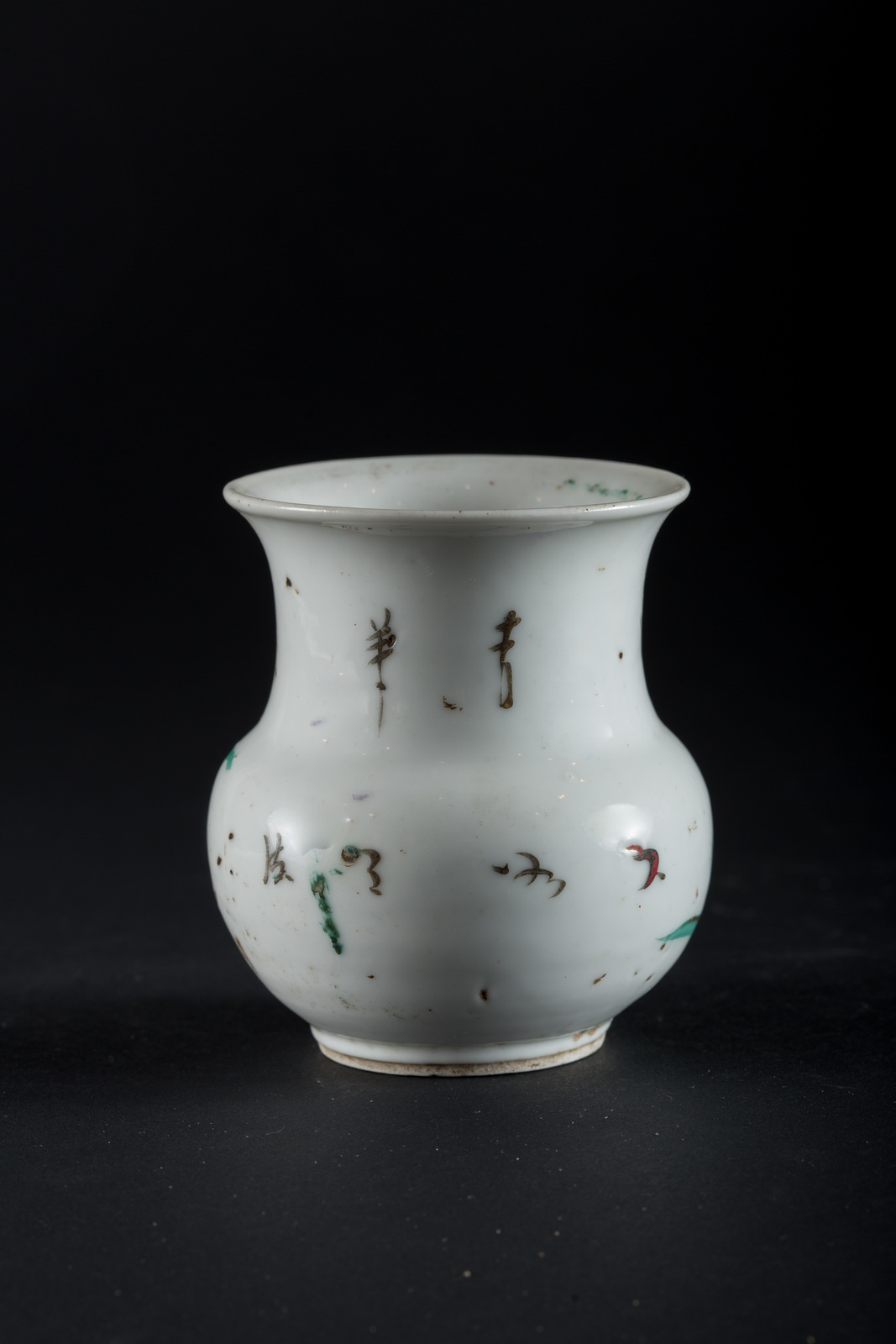 Arte Cinese Vaso in porcellana con decoro di peonia centrale, foglie ed iscrizioni