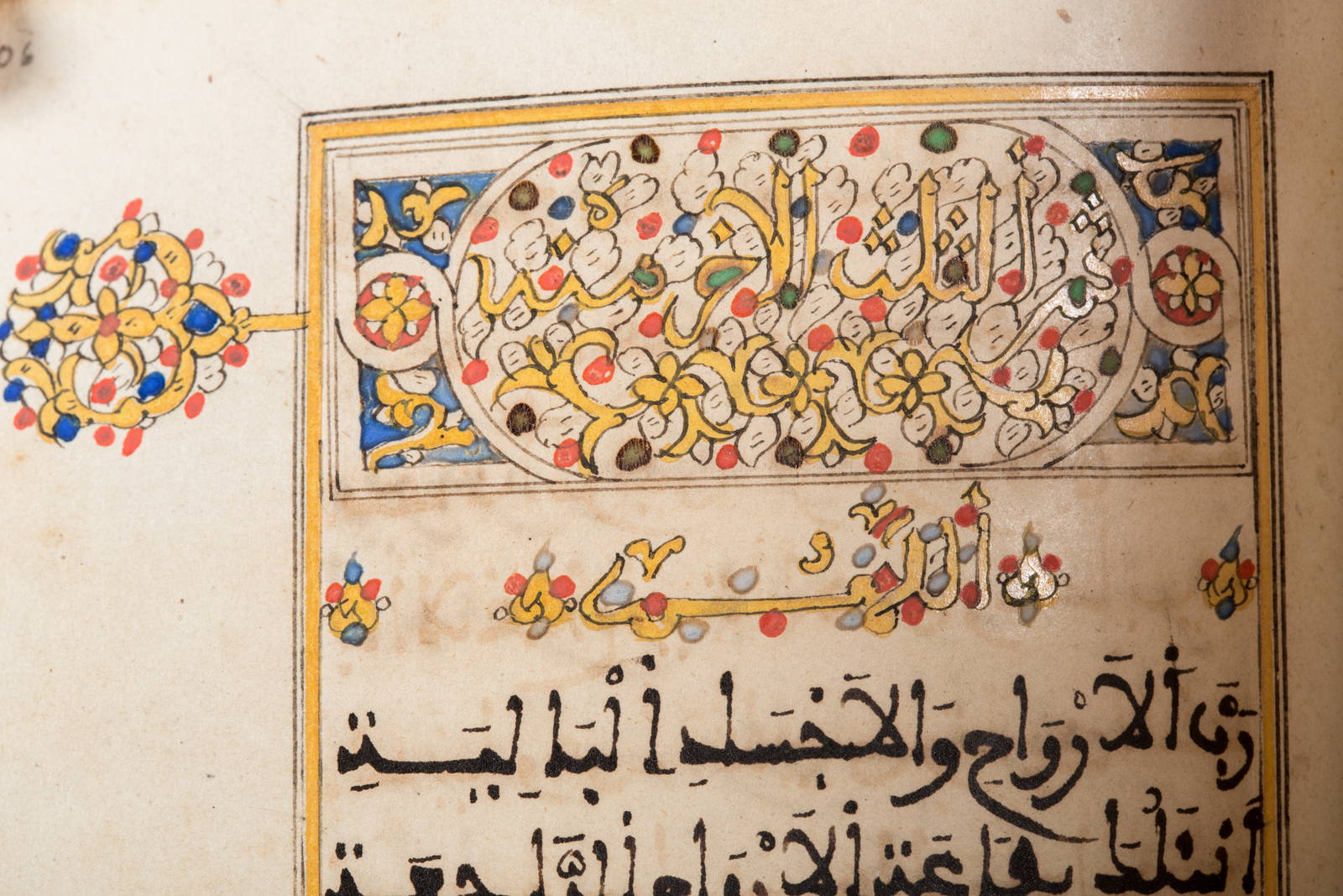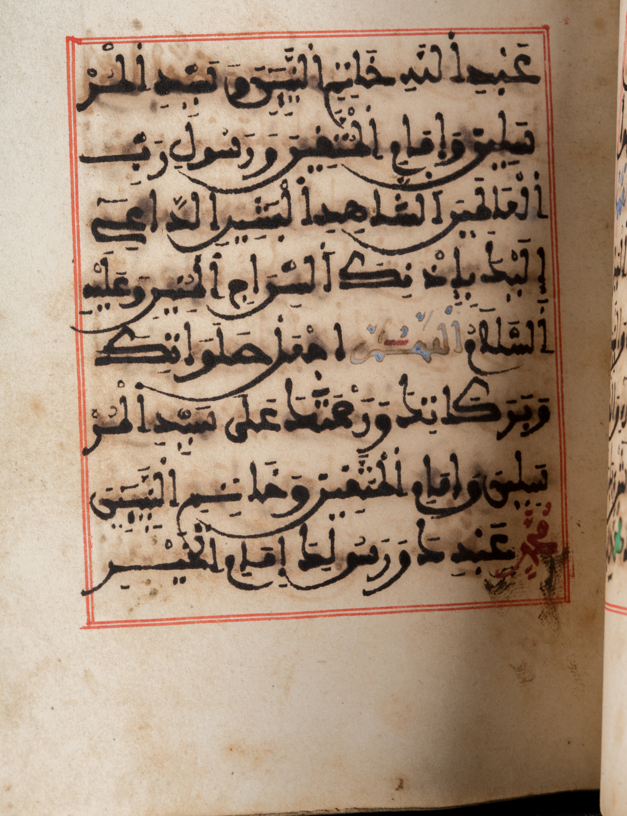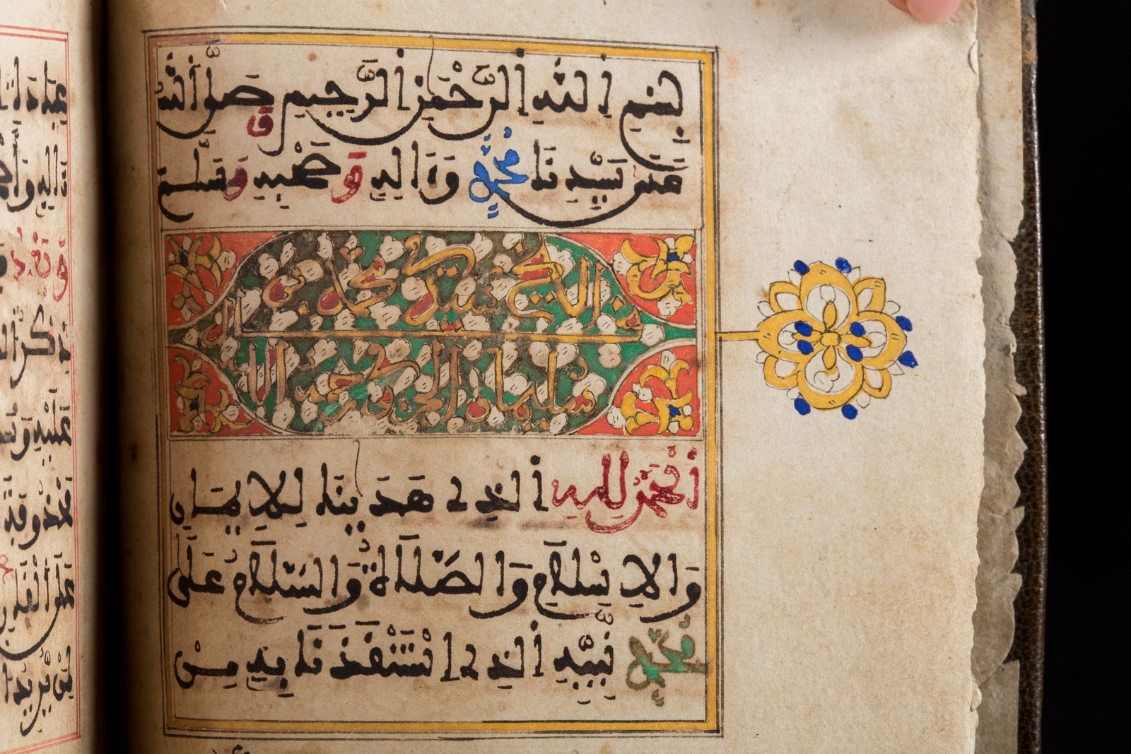Maghreb, metà XIX secolo . . Cm 12,50 x 14,50. Manoscritto in arabo su carta. Dimensioni del foglio 120 X 110 mm, specchio di scrittura, delimitato da doppio filetto rosso 80 X 67 mm. Testo e calligrafia maghebi su singola colonna di otto righe in inchiostro nero, le parole significative sono vergate in inchiostro rosso, verde o azzurro. Composto da 355 carte, completo.